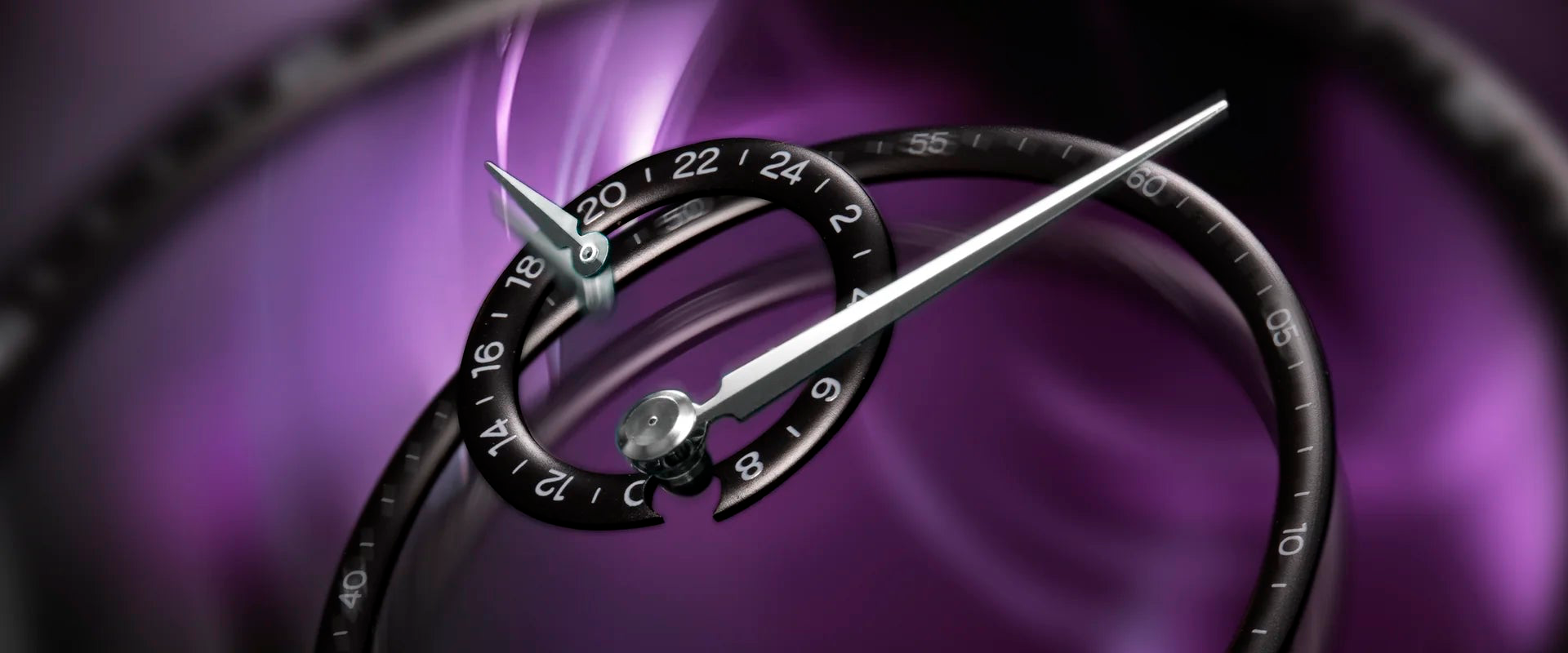 CONSTRUÇÃO MULTICAMADAS: o mostrador roxo fumé esconde uma engenharia precisa - recessos criados por usinagem CNC abrigam anéis abobadados semibrilhantes que indicam minutos e horas em 24 segmentos. Cada nível é montado manualmente para garantir perfeito alinhamento.