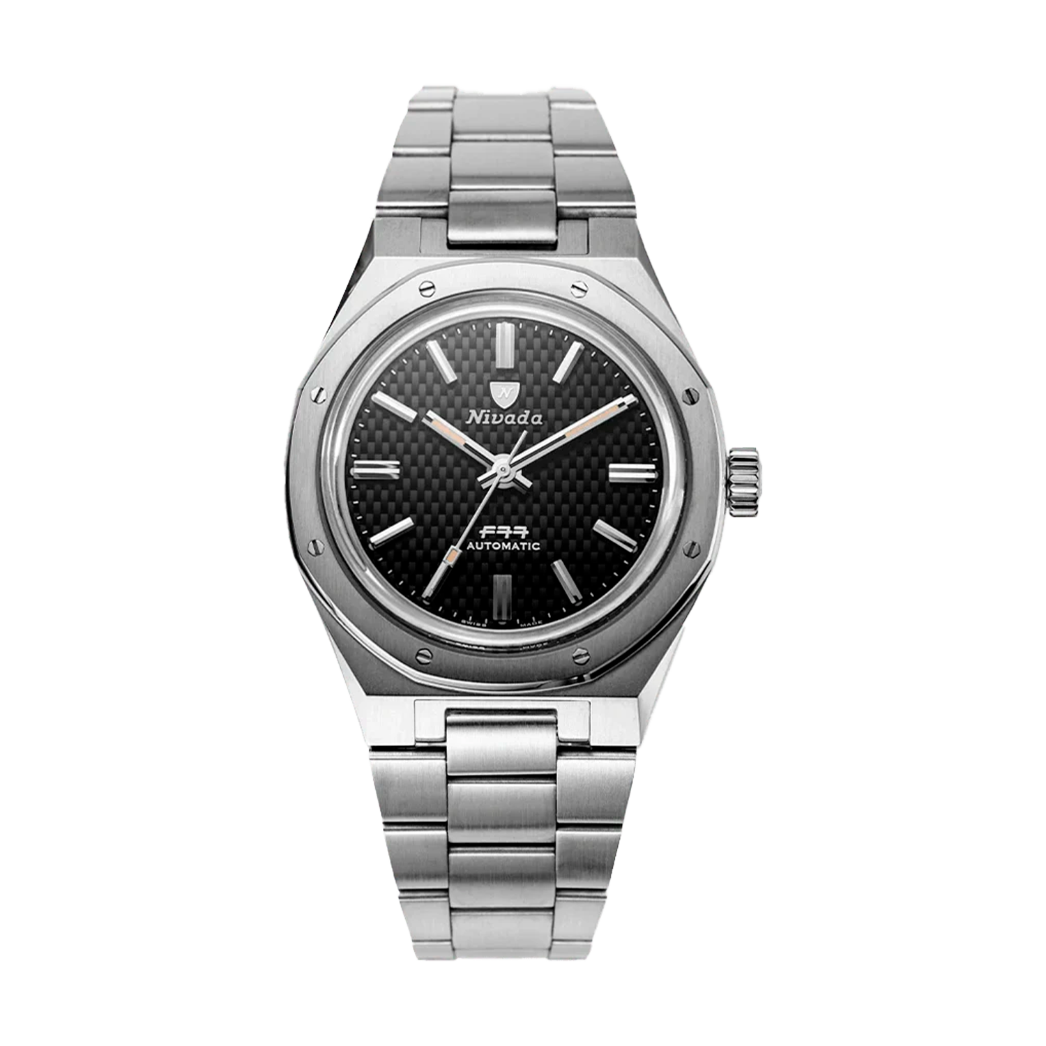 O F77 apresenta um mostrador refinado estilo cesta em preto fosco, que exala sofisticação subestimada. A textura intrincada adiciona profundidade, enquanto os índices aplicados em prata e as mãos estilo bastão realçam seu caráter vintage.