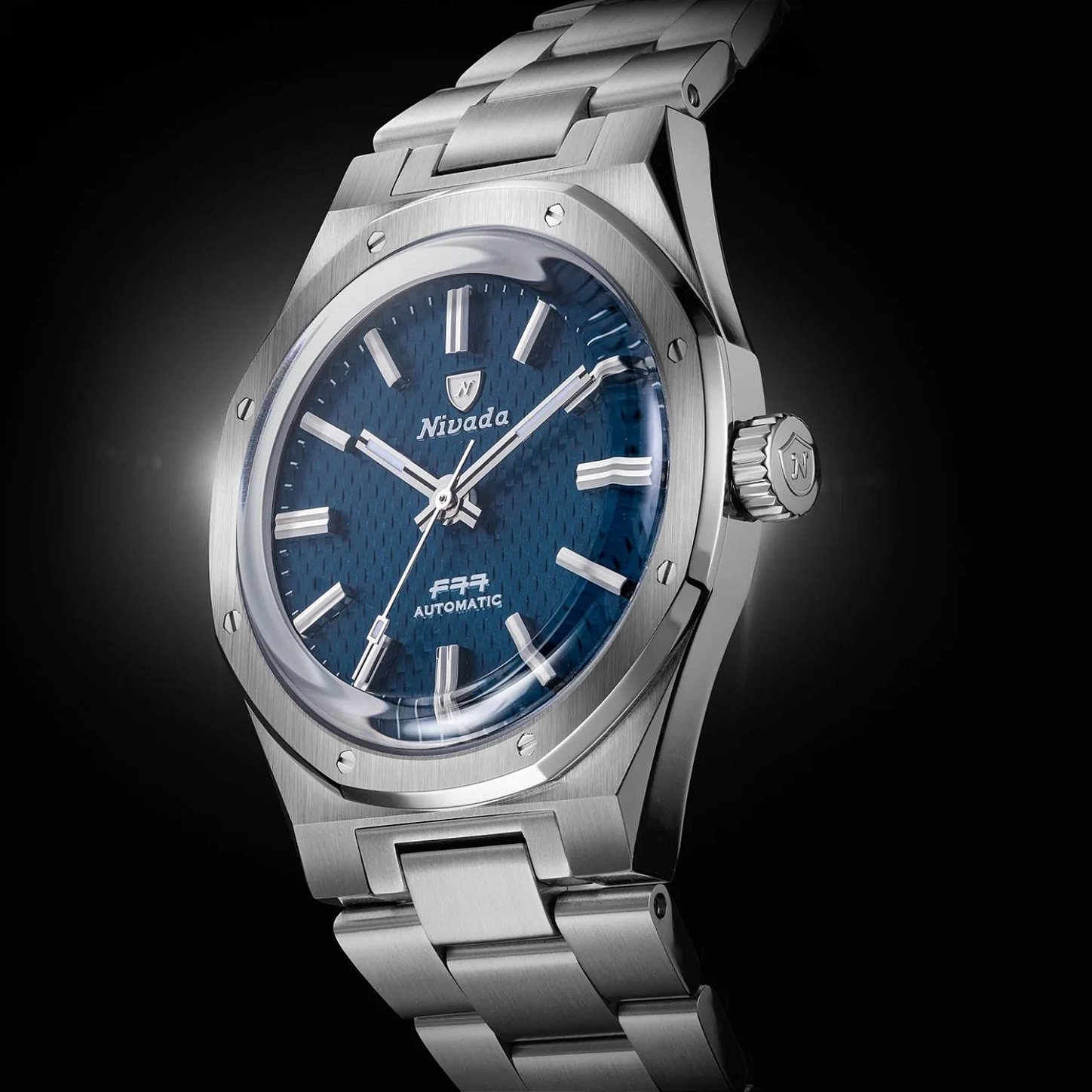 O F77 apresenta um mostrador refinado estilo cesta em um rico tom azul, oferecendo um acabamento vibrante de raio de sol que brinca com a luz ao longo do dia. A textura intrincada adiciona profundidade, enquanto os índices aplicados em prata e as mãos estilo bastão realçam seu caráter vintage.