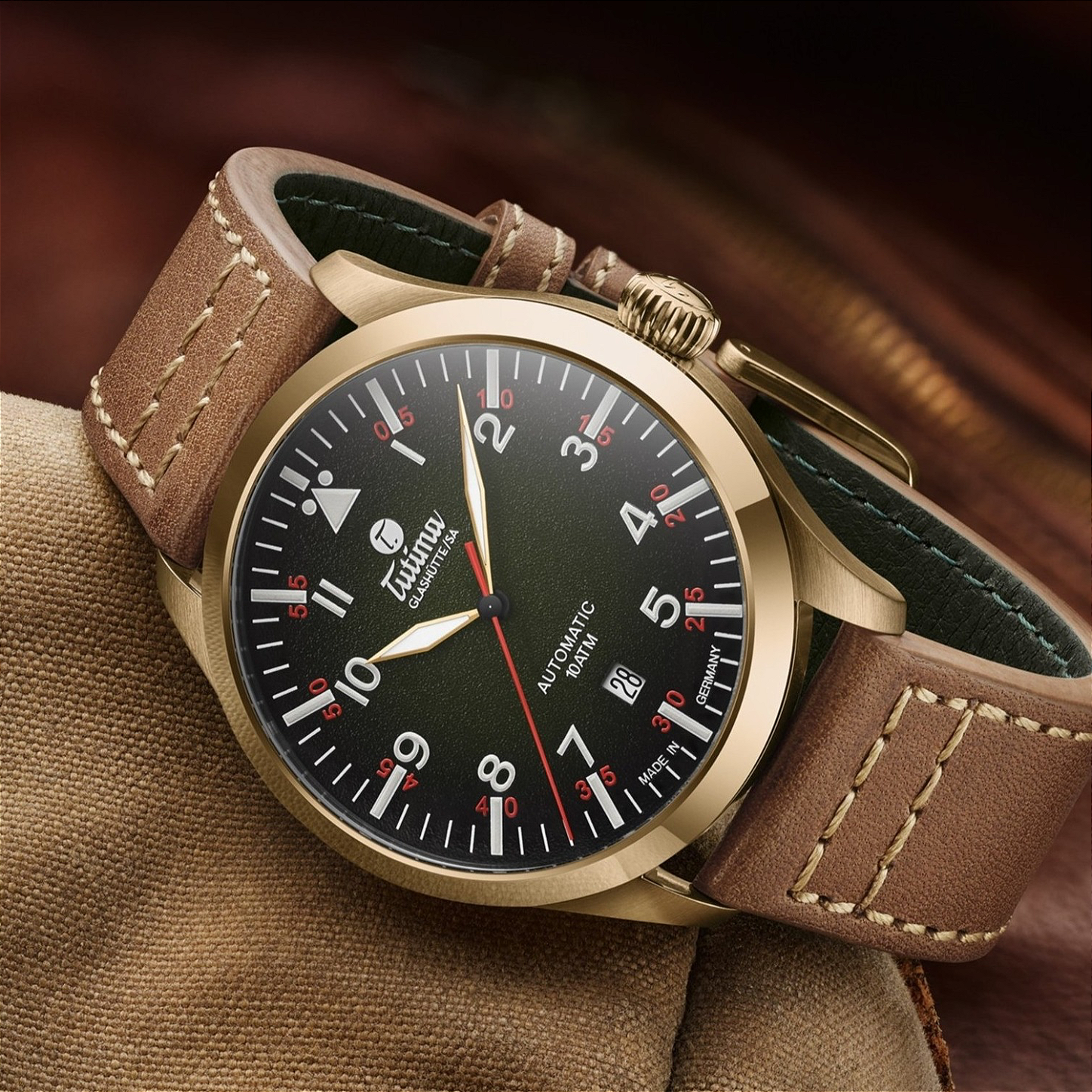 Limitado a 100 peças numeradas, este flieger preserva a essência funcional que tornou Tutima lenda entre pilotos: numeração arábica clara, ponteiros luminescentes em formato pêra e layout minimalista que privilegia a informação essencial. É mais que um relógio de aviação — é um elo tangível com a história aeronáutica alemã, projetado para criar sua própria narrativa através da pátina única que cada unidade desenvolverá.