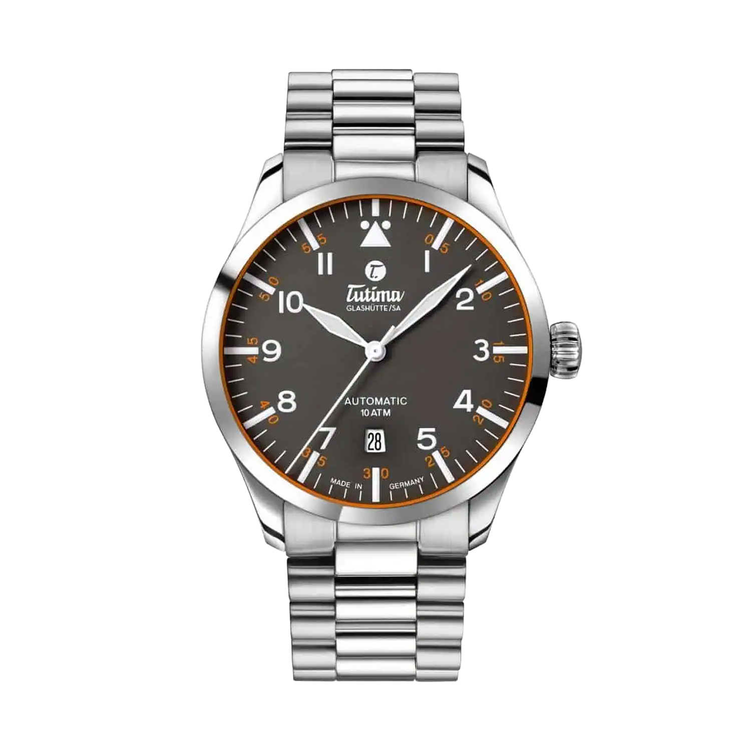 Equipado com o calibre Tutima 330 (base ETA 2824-2) com rotor banhado a ródio e selo dourado 18k, oferece 38 horas de reserva de marcha em uma caixa de aço inoxidável de 41mm com apenas 13mm de espessura. O ponteiro dos segundos e os índices com Super-LumiNova garantem leitura precisa em qualquer condição, tornando este modelo uma fusão perfeita entre tradição piloto e inovação técnica alemã.