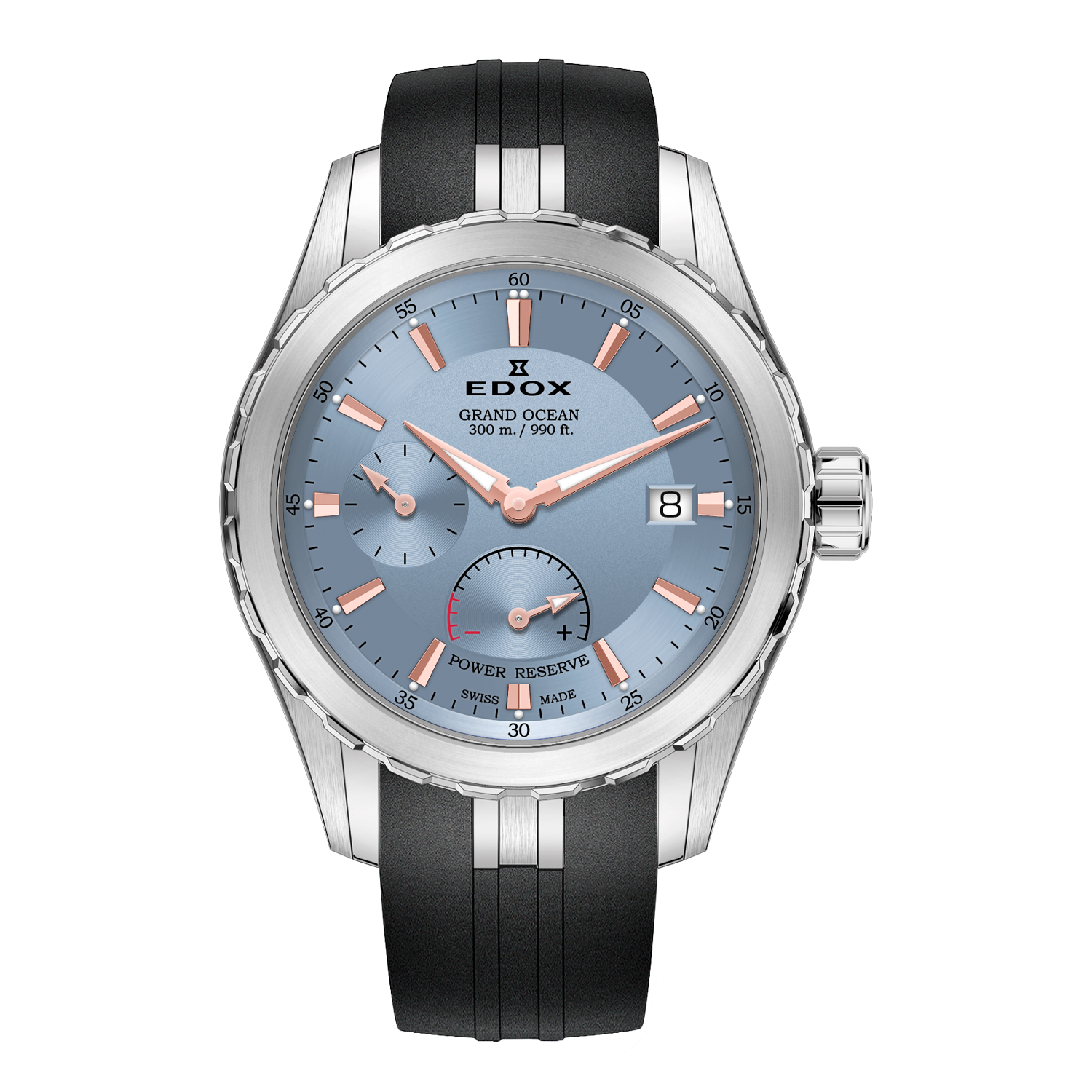 Inspirado na tradição náutica suíça desde 1884, o Grand Ocean Power Reserve Automatic combina sofisticação esportiva com funcionalidade técnica superior. Seu design exclusivo "Triple Horn" de três garras, espelhado na engenharia naval, oferece ergonomia excepcional enquanto o mostrador apresenta pequenos segundos às 9h, indicador de reserva de marcha às 6h e data às 3h — uma disposição que equilibra perfeitamente forma e função.