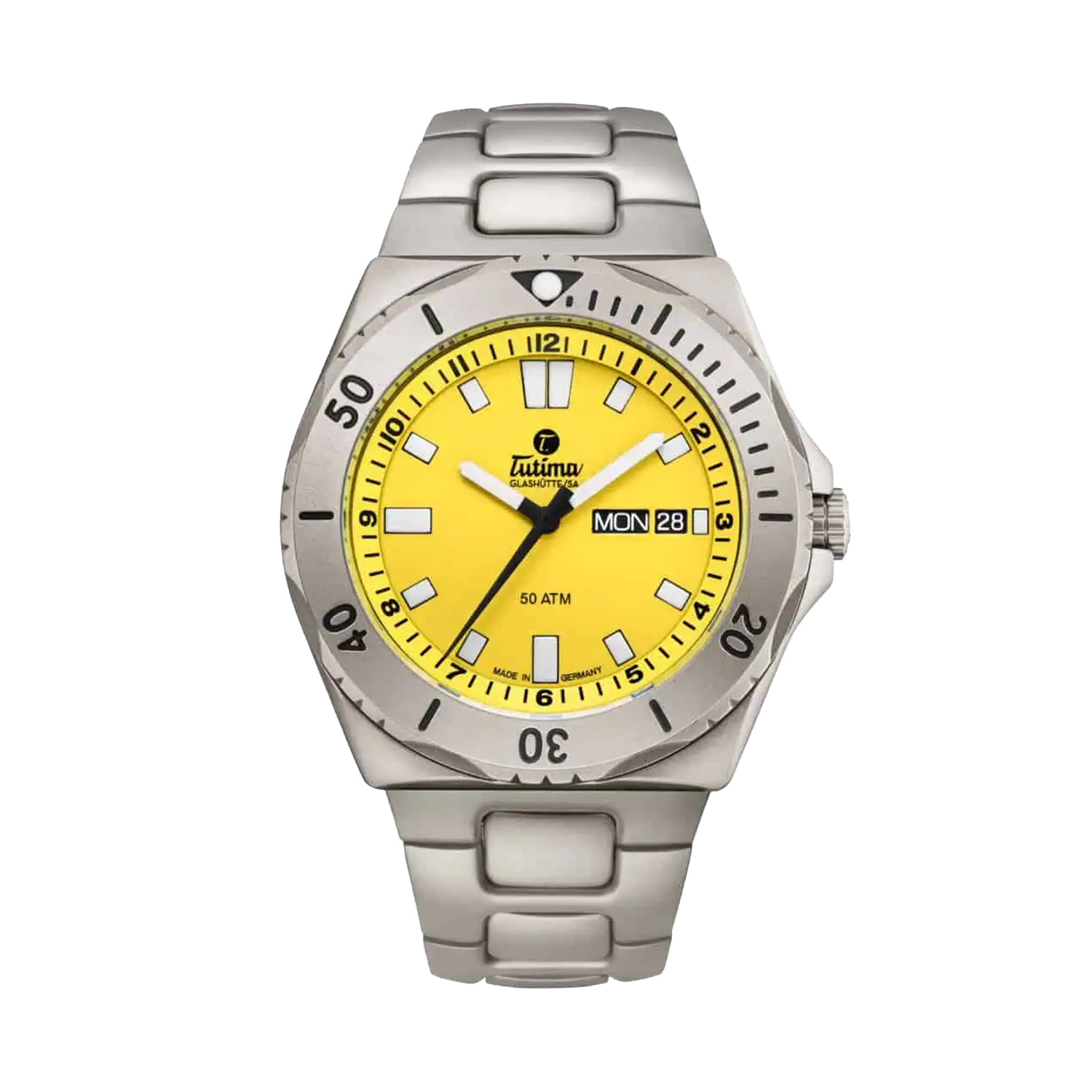 O Tutima M2 Seven Seas representa a evolução natural da tradição alemã de alta relojoaria técnica, criando um relógio de mergulho profissional que combina o titânio mais puro com um mostrador amarelo vibrante que garante legibilidade máxima em condições extremas. Equipado com o movimento interno Tutima 330 de 25 rubis, este modelo oferece 50 ATM de resistência à água e um bezel unidirecional com SuperLumiNova, tornando-se a ferramenta perfeita para aventuras oceânicas.