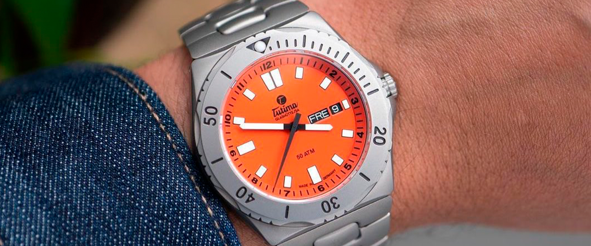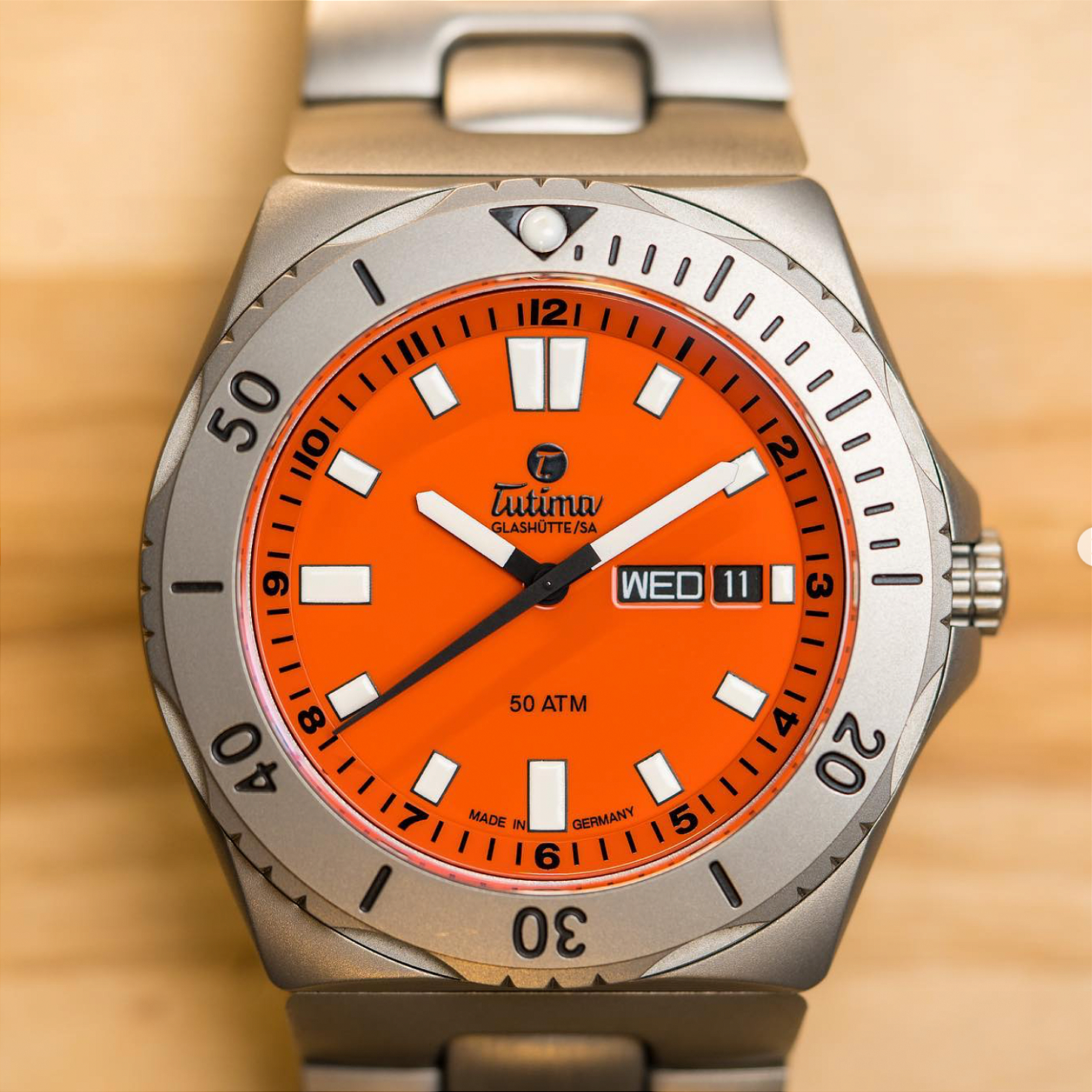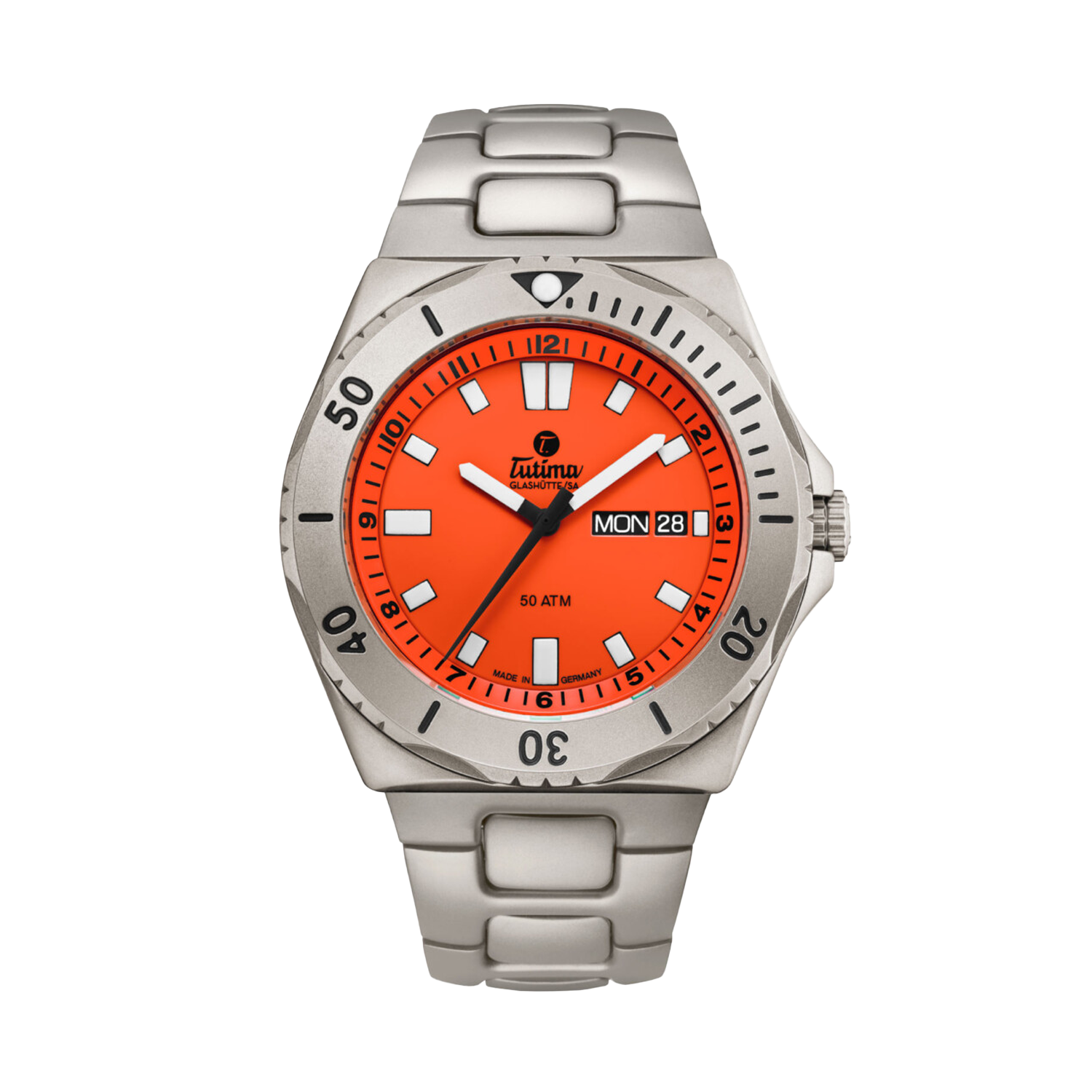 O Tutima M2 Seven Seas Orange 6151-08 representa a expertise alemã em relojoaria técnica, combinando o titanio mais puro com um mostrador laranja vibrante que garante legibilidade máxima em qualquer ambiente. Desenvolvido para mergulhadores profissionais e entusiastas aquáticos, este diver de 44mm traz o robusto movimento automático Tutima 330 com selo dourado no rotor, herança direta da tradição de Glashütte e da experiência militar da marca.