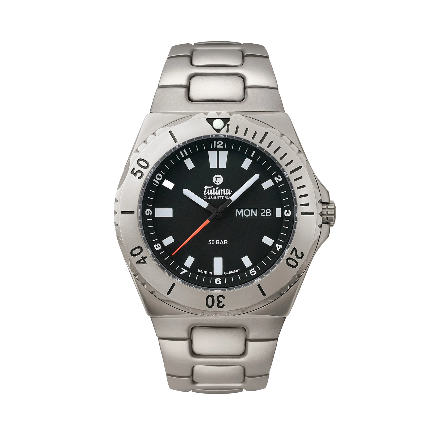 Forjado na tradição alemã de engenharia de precisão, o Tutima M2 Seven Seas 6151-02 representa o ápice da relojoaria subaquática germânica. Construído em titânio puro com mostrador negro veludo, este relógio de mergulho profissional oferece resistência extrema a 50 ATM (500 metros) combinada com o requinte estético que apenas os mestres relojoeiros de Glashütte sabem imprimir. O calibre Tutima 330 com selo dourado no rotor evidencia a excelência manufatureira da marca que equipa os pilotos da força aérea alemã.