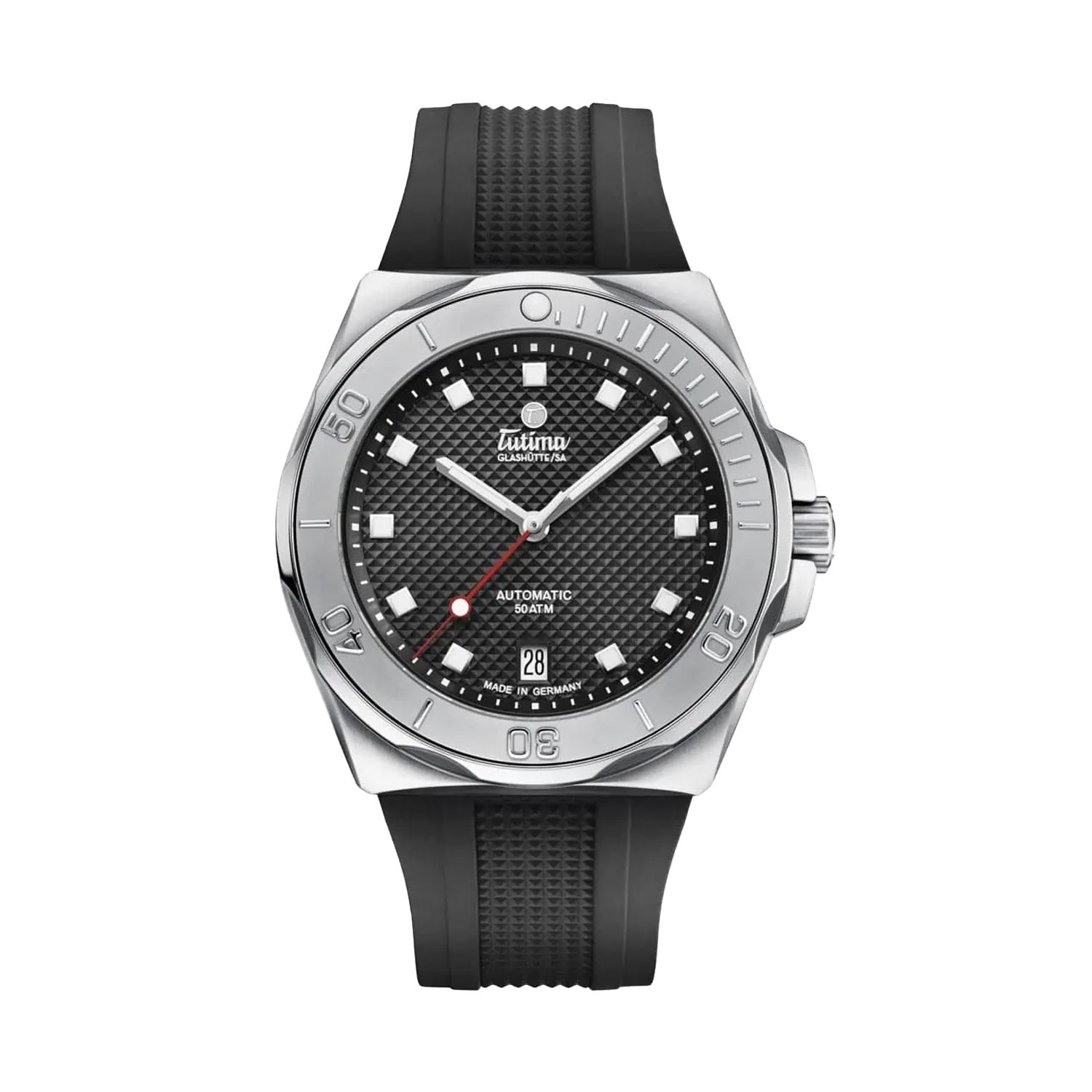 Equipado com o movimento automático Tutima 330 com rotor selado a ouro, este diver de 40,2mm mantém o DNA militar da marca em uma construção refinada. A pulseira de borracha FKM e coroa rosqueada entre protetores laterais asseguram durabilidade extrema, tornando-se o companheiro ideal para aventuras aquáticas e uso urbano sofisticado.