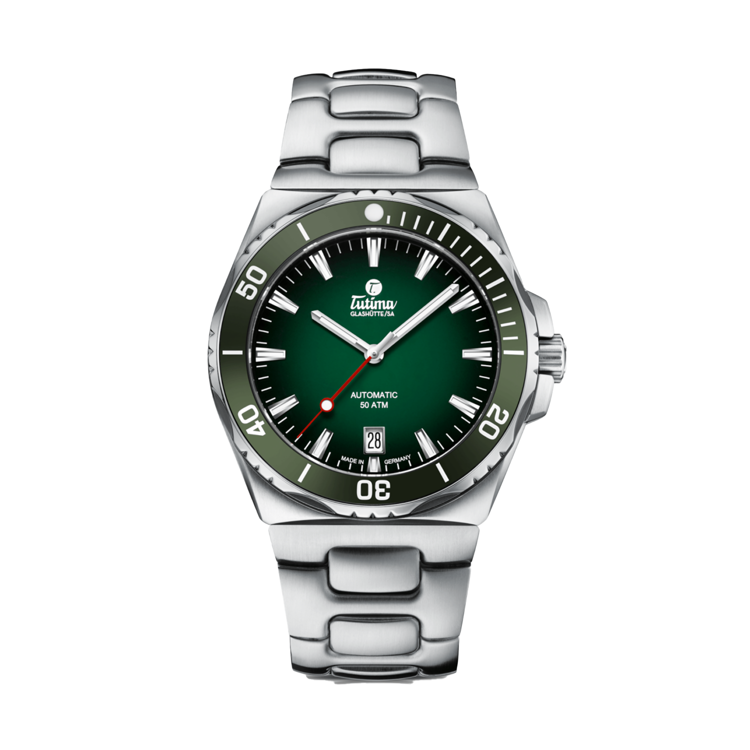O Tutima Seven Seas S 6156-06 destaca-se pelo mostrador verde degradê de impacto visual único, com bezel cerâmico colorido unidirecional e movimento manufaturado Calibre 330. Com caixa escovada de 40mm e resistência de 5 ATM, este diver alemão representa a tradição relojoeira de Glashütte em um design moderno e versátil, ideal para mergulho recreativo e uso urbano sofisticado.