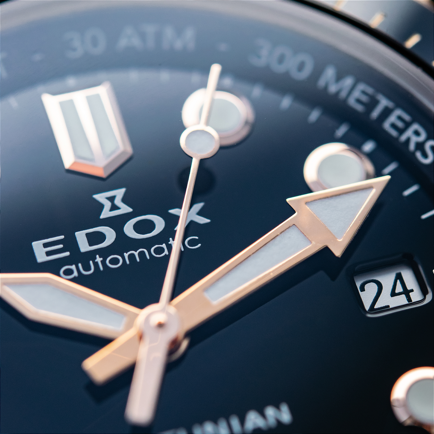 CALIBRE 808 EDOX: exclusivo movimento automático baseado no renomado La Joux-Perret G100, oferecendo 68 horas de reserva de marcha - quase três dias de funcionamento contínuo. Essa autonomia permite uso durante finais de semana inteiros sem necessidade de reposição de corda, revolucionando a praticidade no uso diário.