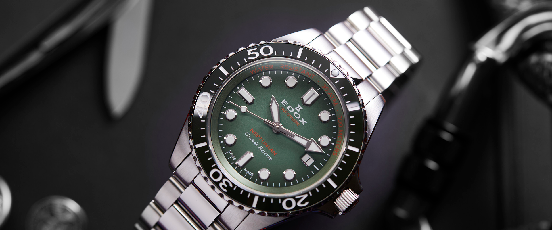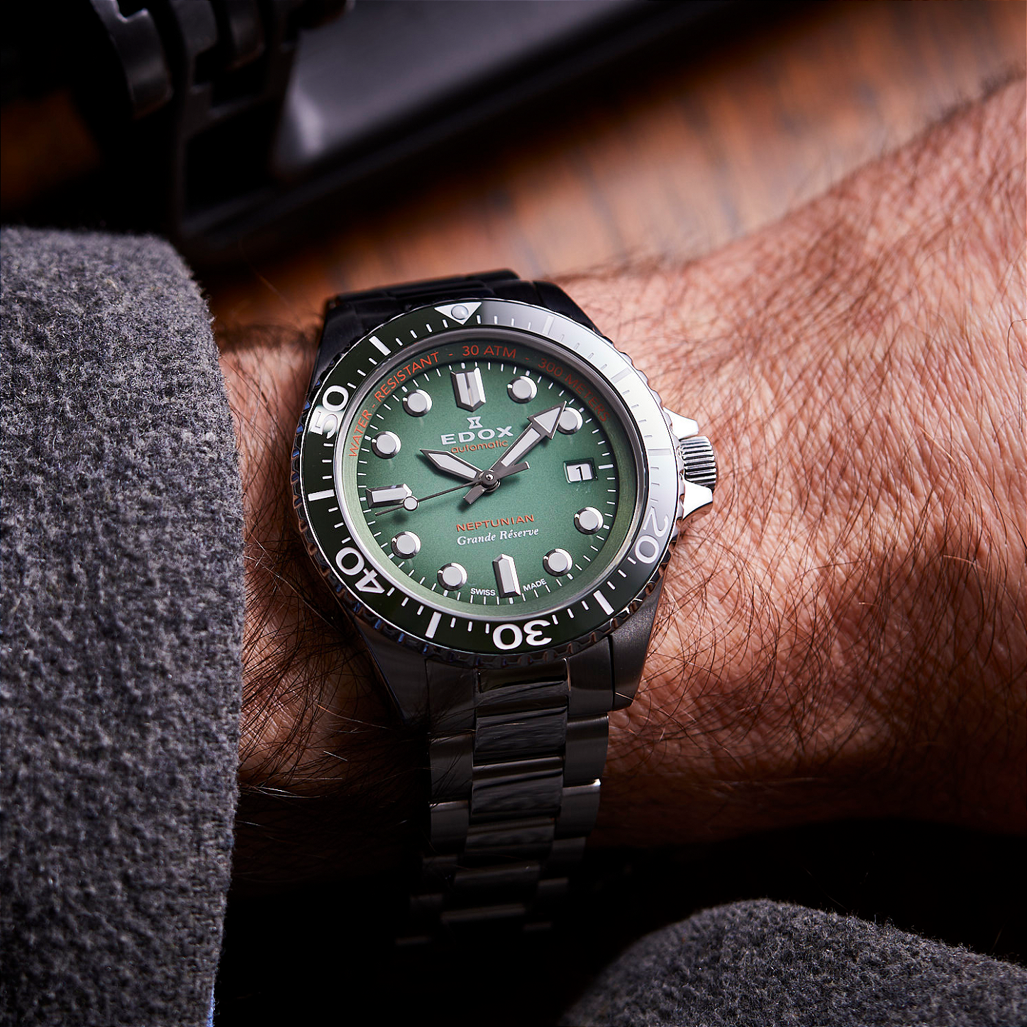 Inspirado no legado dos mergulhadores profissionais e na mitologia marítima, o Edox Neptunian Grande Réserve traz um mostrador verde profundo que evoca as águas oceânicas mais cristalinas. Com luneta cerâmica unidirecional e resistência de 30 ATM, este diver suíço combina a robustez técnica necessária para explorações submarinas com a elegância urbana para uso cotidiano. A gravação de Netuno no fundo da caixa homenageia o deus romano dos mares, simbolizando o domínio absoluto sobre os elementos aquáticos.