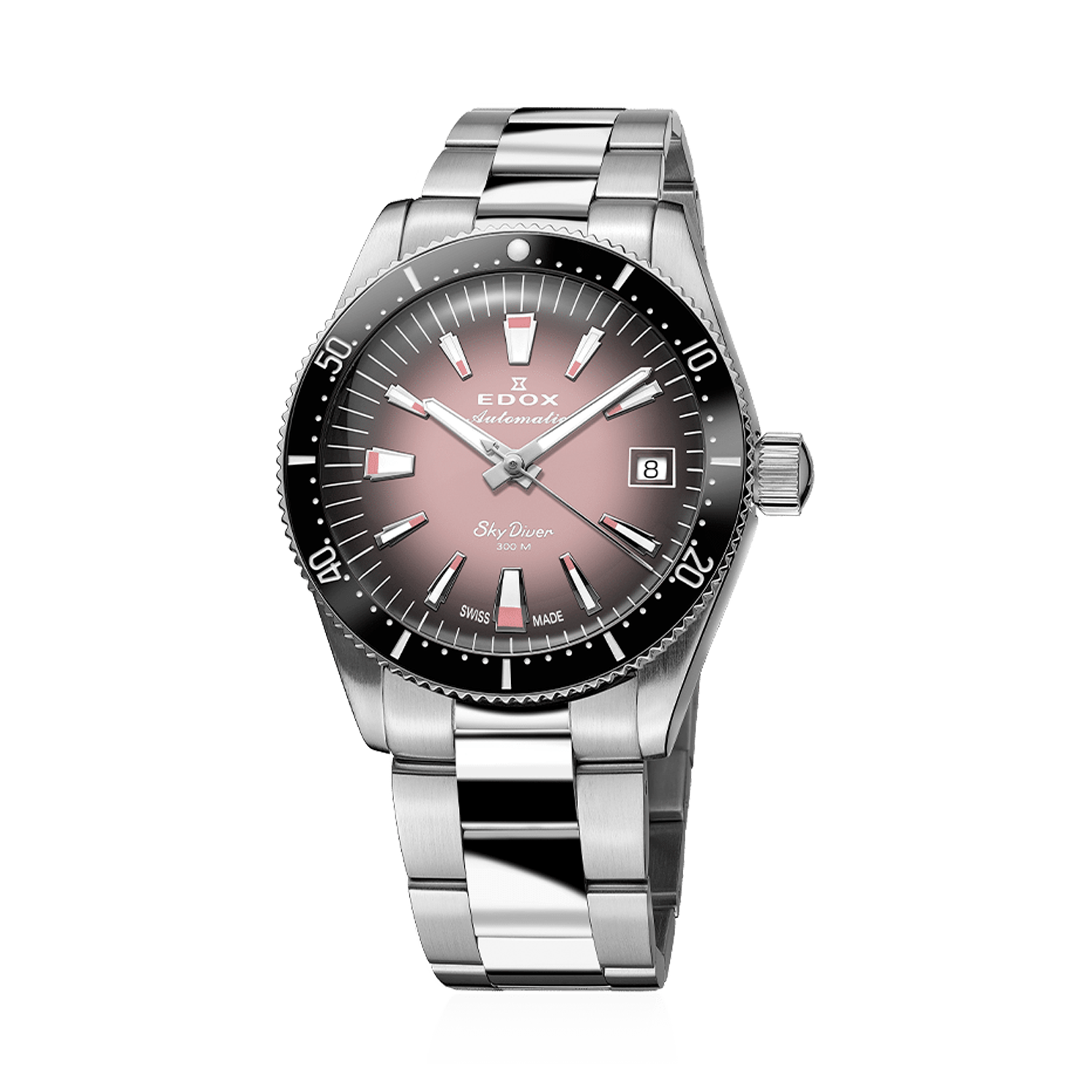 Descendente direto dos lendários relógios para paraquedistas de 1973, o Edox Skydiver 38 Date combina o charme vintage dos skin divers com tecnologia suíça contemporânea. Seu mostrador roxo gradiente e bezel cerâmico criam uma personalidade única, enquanto o tamanho compacto de 38mm oferece versatilidade para qualquer pulso. Esta edição especial NDRO celebra a herança aeronáutica da marca com elegância discreta.