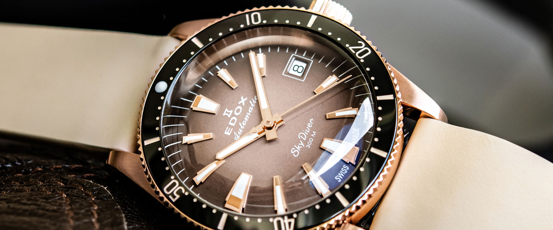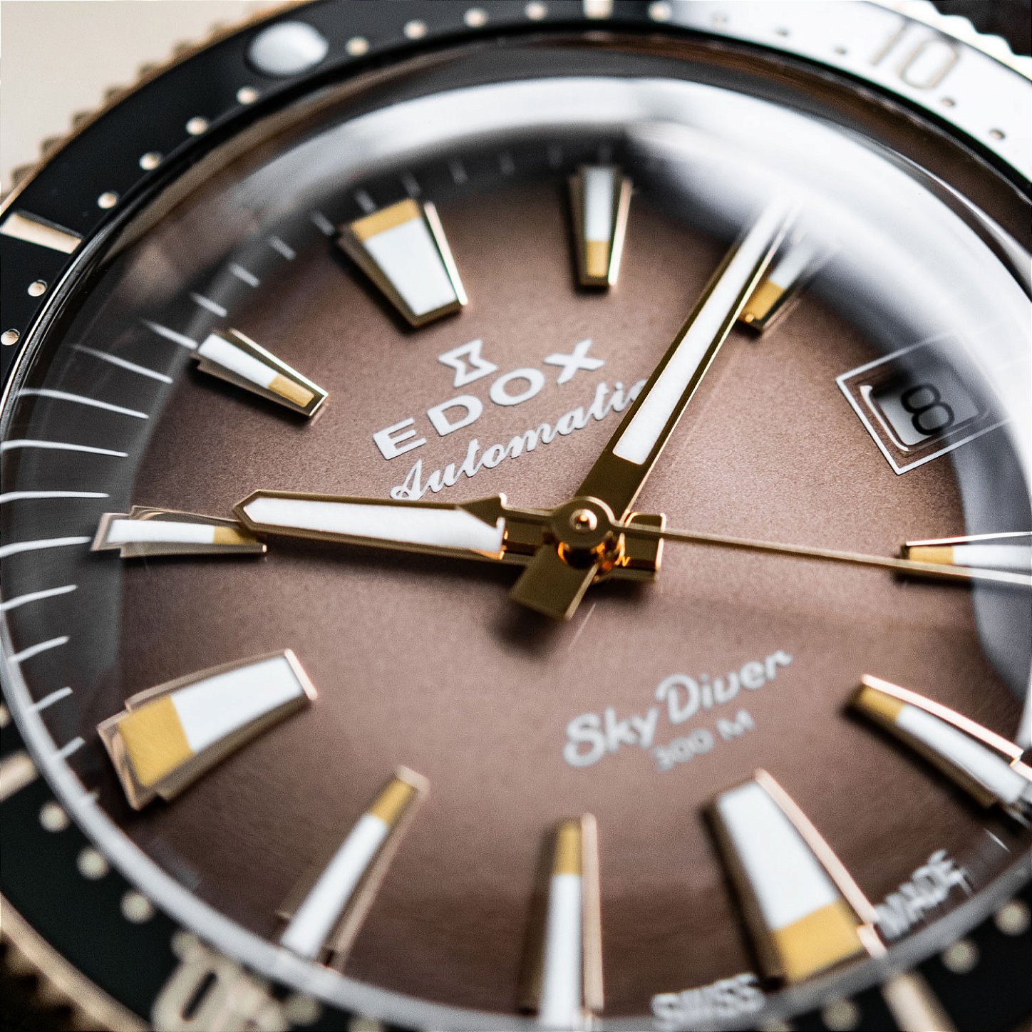 Equipado com o robusto Calibre 80 (Sellita SW200-1) e cristal de safira ultra-domed com revestimento antirreflexo, o Skydiver oferece 300 metros de resistência à água através da tecnologia exclusiva Double O-Ring da Edox. O acabamento rose gold PVD na caixa de aço inoxidável 316L, combinado com duas pulseiras de couro vintage incluídas, fazem deste modelo uma peça versátil que honra 140 anos de expertise suíça em relógios esportivos de precisão.