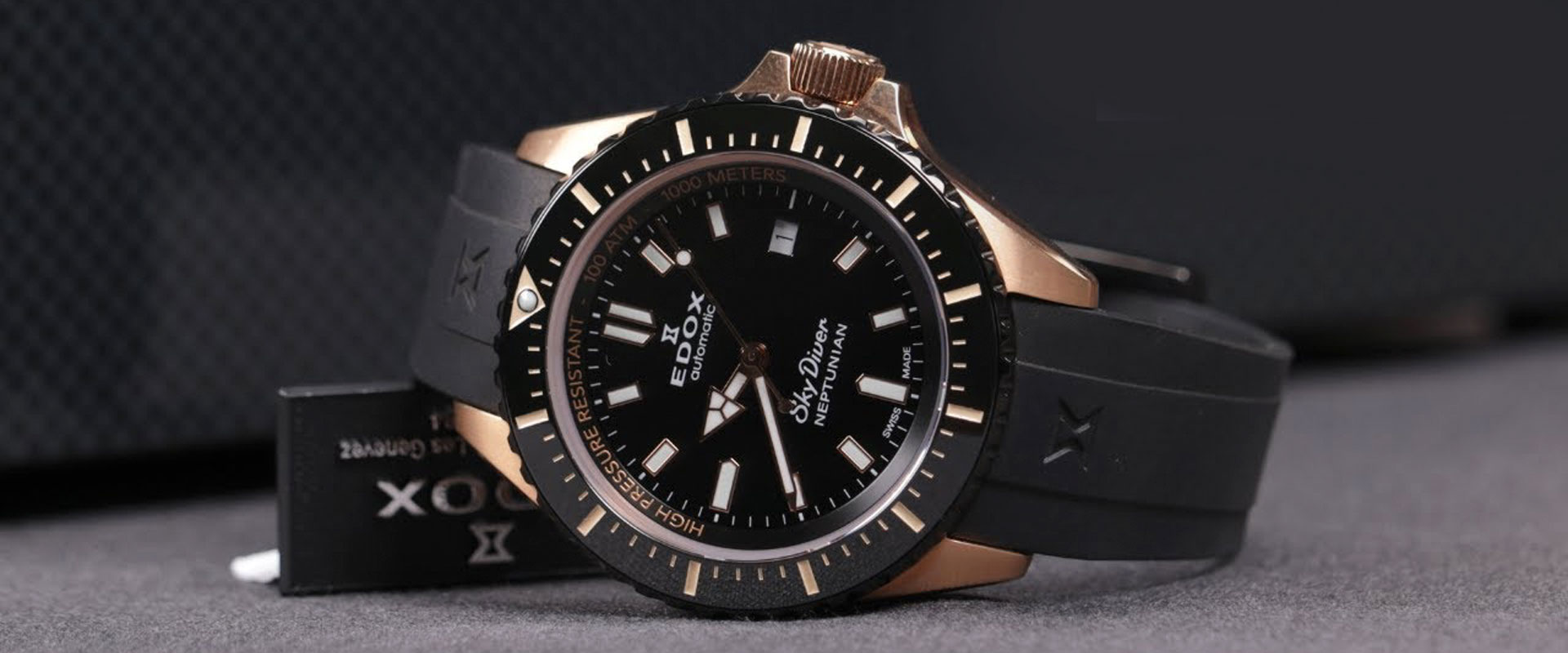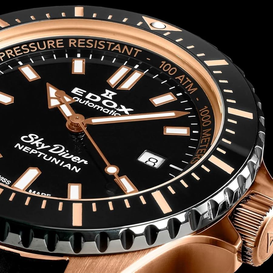 Inspirado na tradição militar dos paraquedistas de elite e forjado pela experiência de quase 50 anos, o Edox Skydiver Neptunian 80120-37RNNCA-NIR representa o ápice da engenharia suíça em relógios de mergulho. Com sua resistência extraordinária de 1000 metros e acabamento PVD rose gold sobre aço 316L, este diver profissional une robustez extrema à elegância contemporânea, mantendo viva a herança do lendário SkyDiver de 1973.