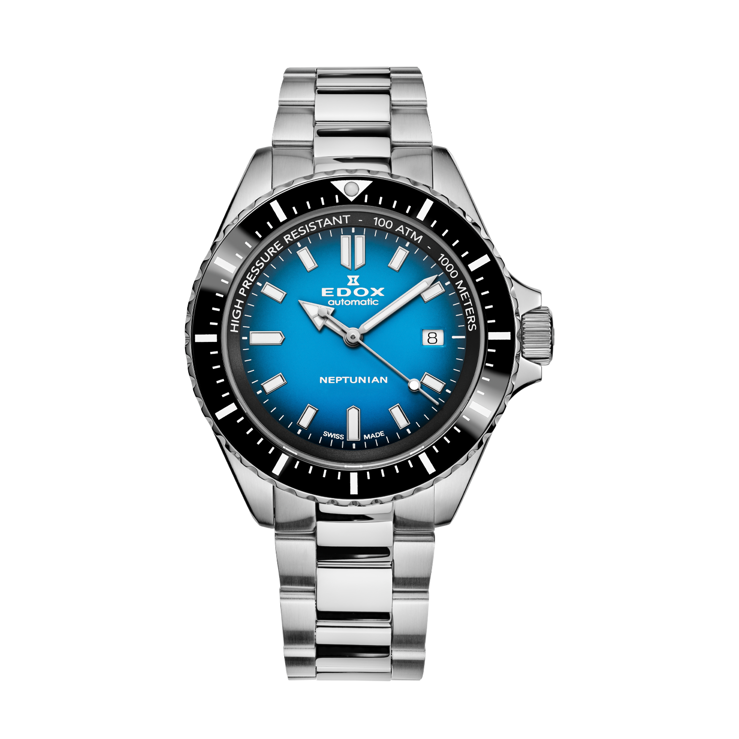 Descendente direto do lendário SkyDiver criado há 50 anos para paraquedistas de elite, o Edox Neptunian Automatic traz uma resistência extraordinária de 1000 metros com movimento automático suíço Sellita SW200. O mostrador azul profundo combina com bezel cerâmico unidirecional, enquanto a válvula de hélio e cristal de safira de 3mm garantem performance técnica absoluta em qualquer ambiente extremo.