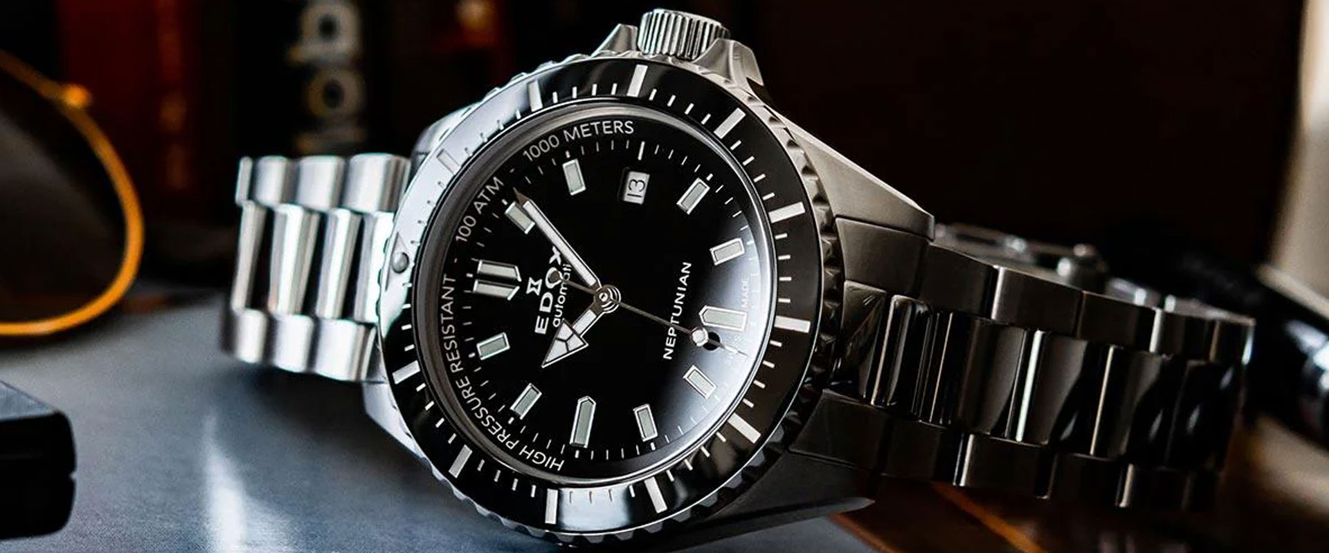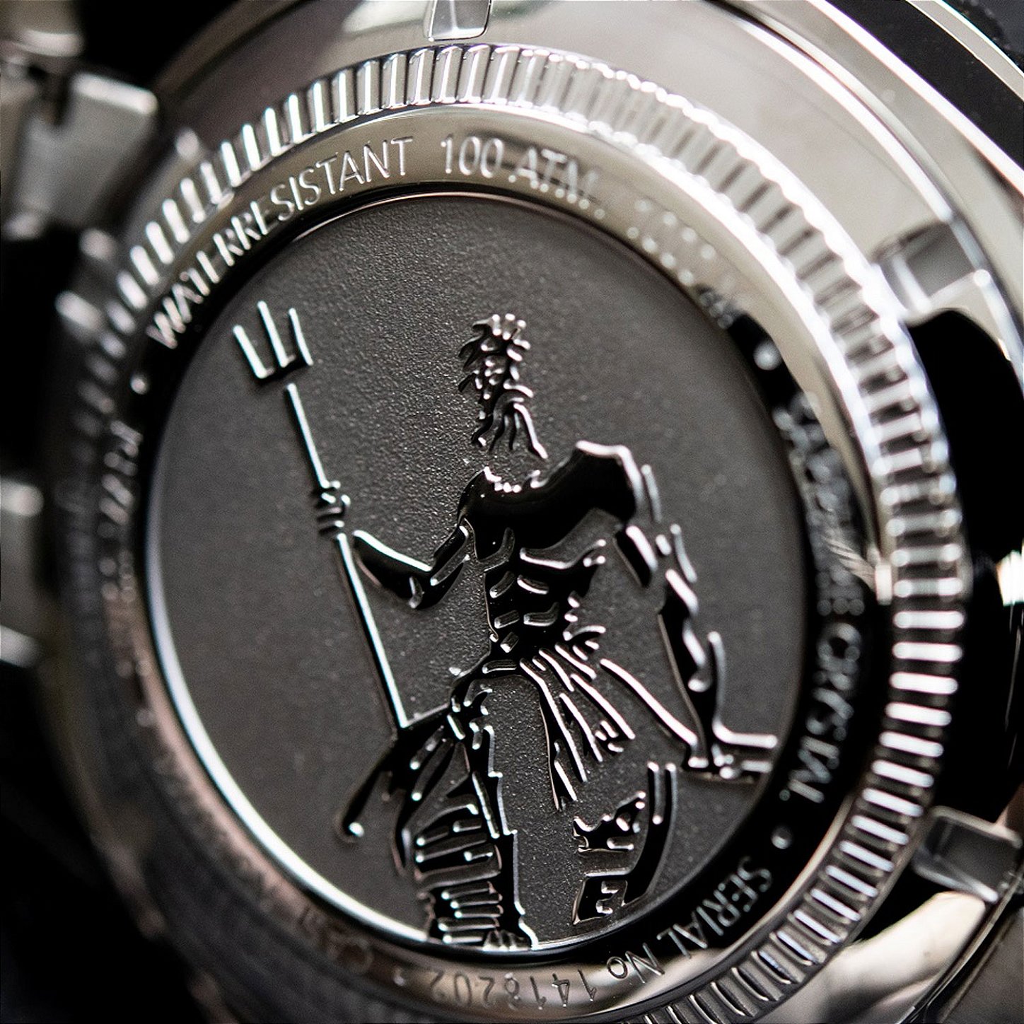 A gravação de Netuno, deus romano dos mares, representa a transição dos SkyDiver originais - criados para paraquedistas - para os oceanos profundos. Esta evolução reflete a versatilidade da engenharia suíça Edox: da precisão cronométrica exigida em saltos militares para a resistência absoluta demandada pelo mergulho profissional.