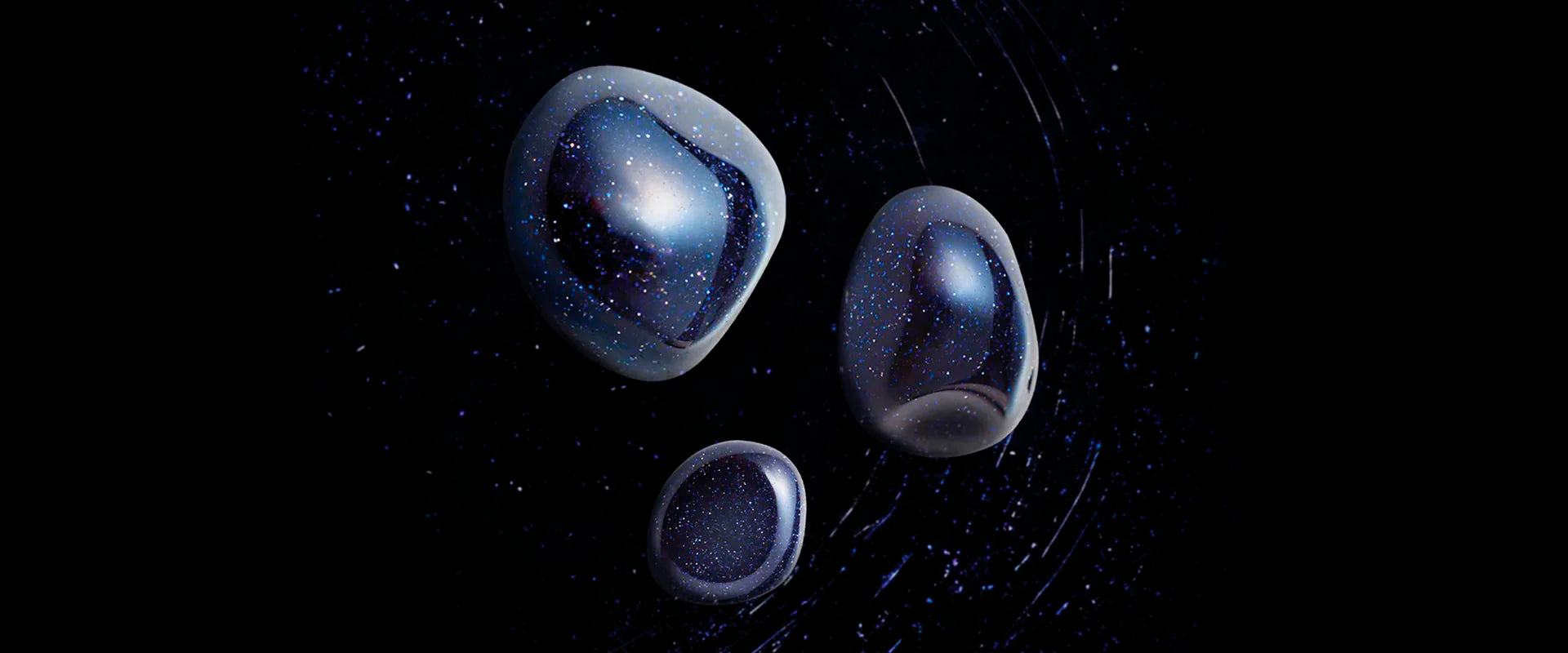PROFUNDIDADE CÓSMICA: o azul profundo da aventurina, contra o qual se destacam constelações de minúsculos fragmentos luminosos, evoca o mistério denso das estrelas e a escuridão do cosmos. A construção é completada pelo aro com padrão sunburst que adiciona complexidade visual ao conjunto.