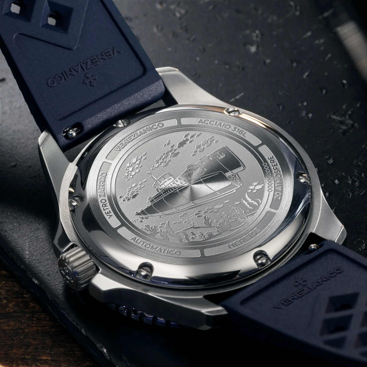 Nomeado após o submarino Nereide, este diver combina tradição artesanal de Murano com engenharia naval veneziana. O movimento automático Miyota 9039 e a resistência de 20 ATM garantem performance técnica, enquanto a pulseira Tropic de borracha FKM com sistema de troca rápida oferece conforto e versatilidade para qualquer ocasião.