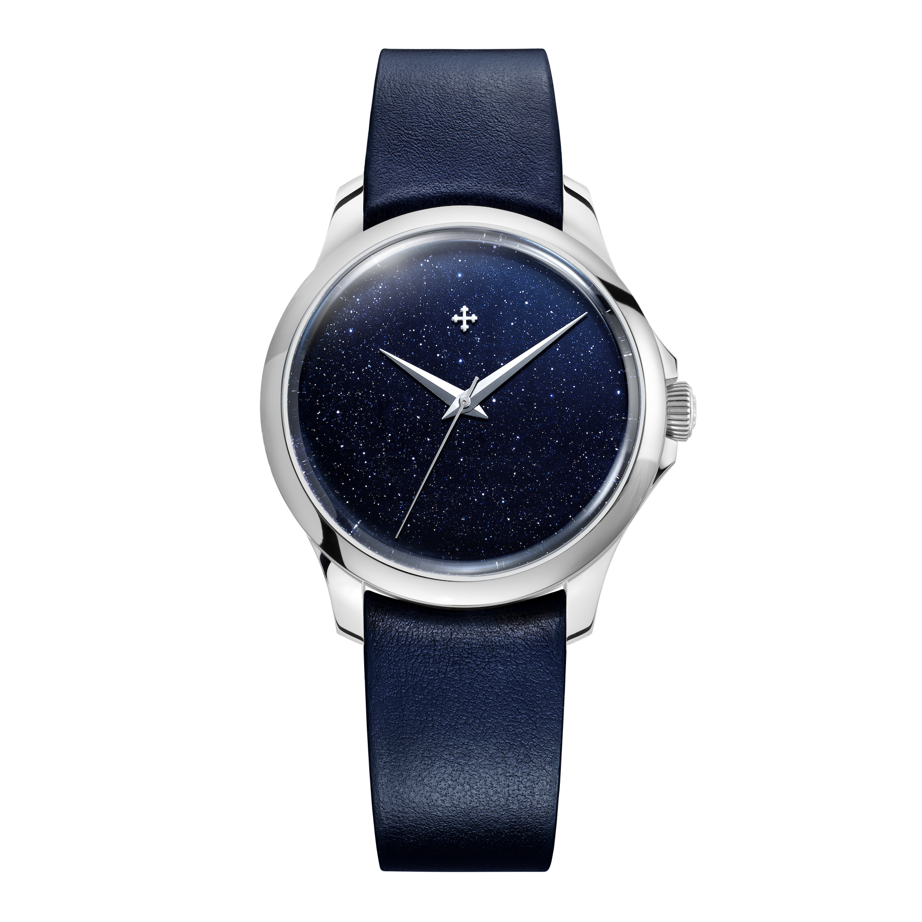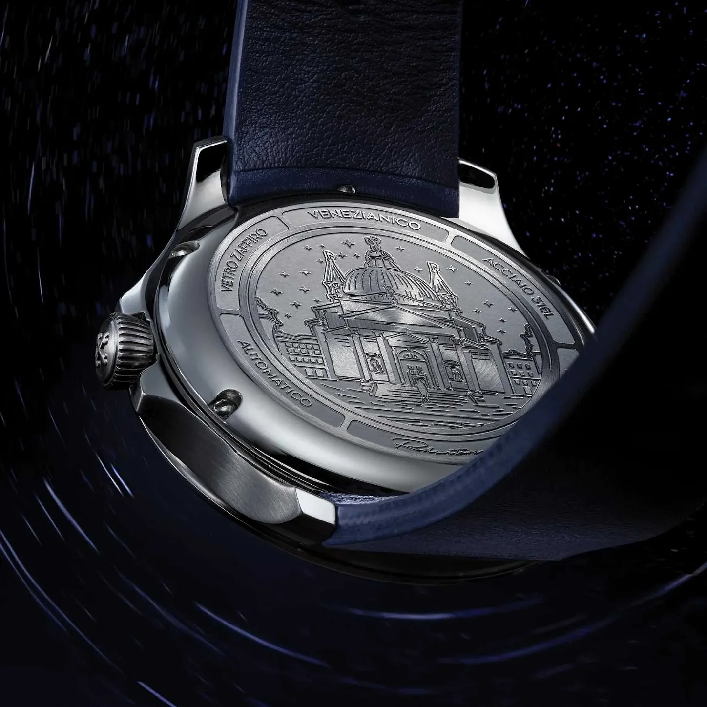 Inspirado na Basílica del Redentore, obra-prima arquitetônica de Andrea Palladio, o Redentore Avventurina 36 traz um mostrador de vidro aventurina azul genuíno, material descoberto em Veneza no século XVII. As inclusões de cobre criam um efeito cintilante único que remete a um céu estrelado, tornando cada peça exclusiva pela arte milenar dos vidreiros de Murano.