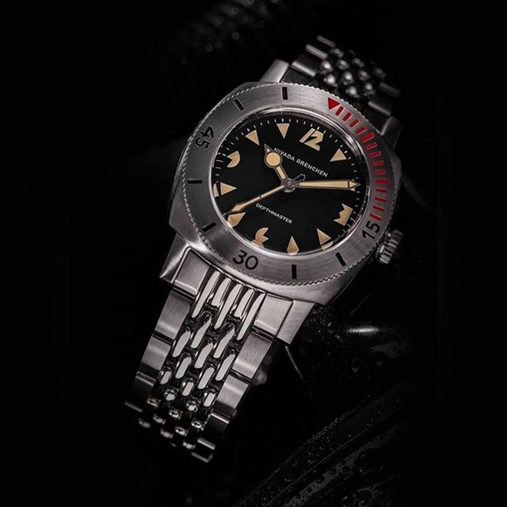 Apelidado de "Pac-Man" por seus marcadores Art Déco únicos, o Nivada Grenchen Depthmaster é uma lenda entre os relógios de mergulho. Lançado nos anos 60, foi um dos primeiros relógios do mundo a atingir a marca de 1000 metros de resistência à água.