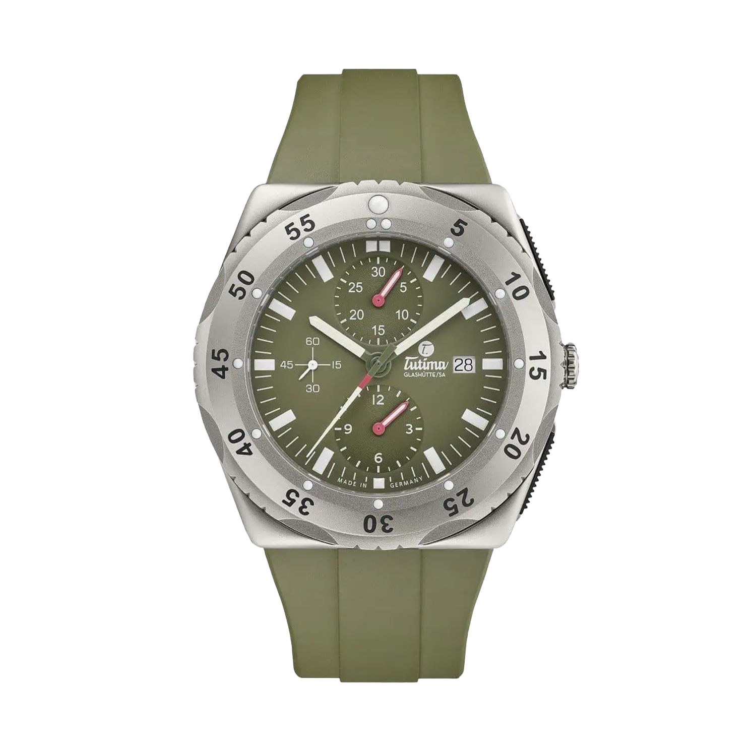 Equipado com o movimento manufaturado Tutima 310 e resistência de 30 ATM, este cronógrafo combina a tradição relojoeira de Glashütte com design robusto e orientado para aventura. A pulseira de borracha integrada e os pushers texturizados proporcionam ergonomia superior, tornando-o ideal para expedições, mergulho e o lifestyle de quem busca propósito além do pulso.