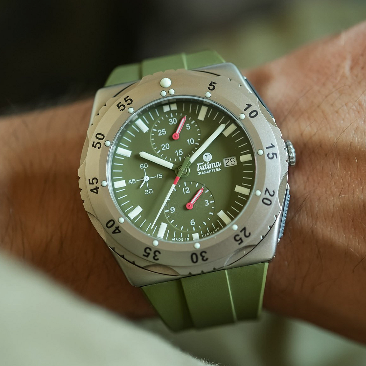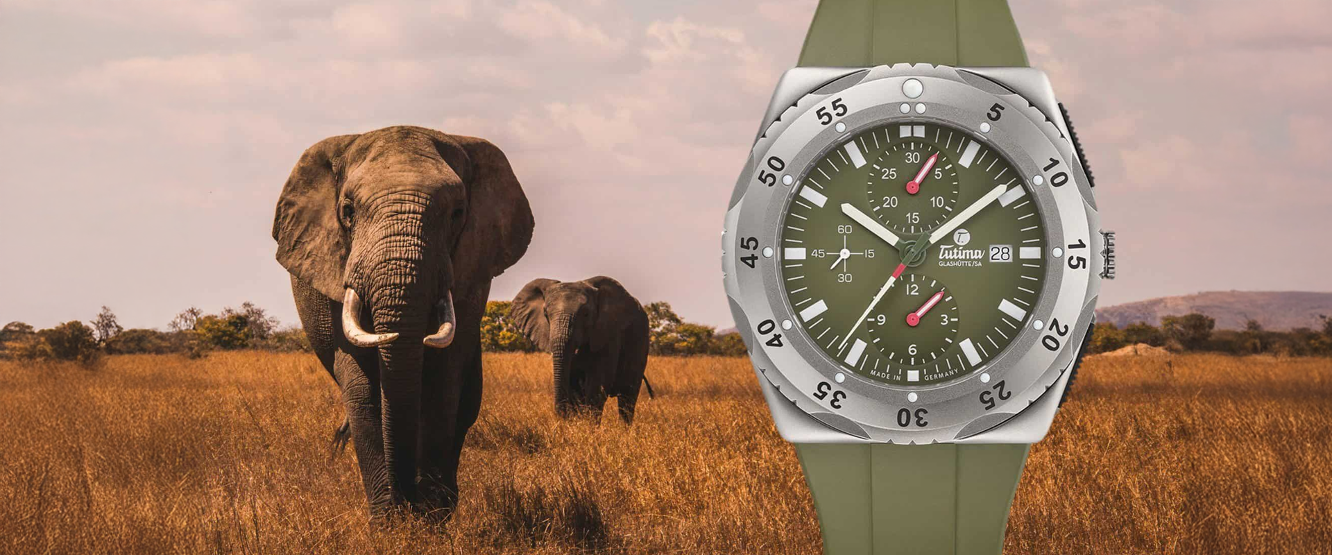 O Tutima Mara Safari Chronograph é uma edição limitada de 250 peças que une alta relojoaria alemã e conservação ambiental. Cada relógio vendido apoia o Mara Elephant Project na proteção de elefantes no ecossistema Serengeti/Maasai Mara. A caixa de titânio pearlblasted de 46,5mm e o mostrador verde safari evocam a natureza selvagem africana, enquanto a luneta bidirecional com cápsulas luminescentes garante funcionalidade extrema em qualquer condição.