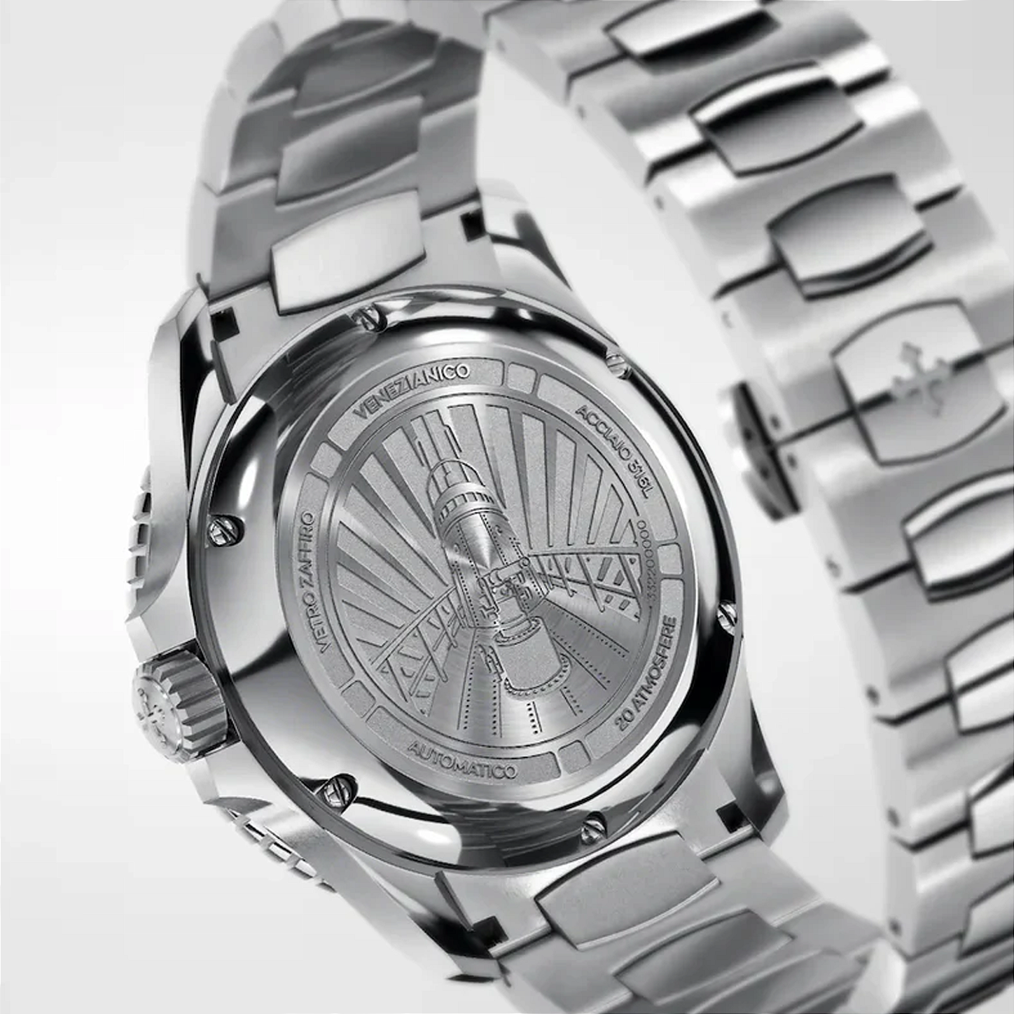 O caseback gravado com o submarino Nereide presta homenagem à tradição naval que conecta Veneza aos oceanos do mundo. Este submarino representa a evolução da maestria naval veneziana, da época das galés comerciais até as modernas embarcações de exploração marítima.