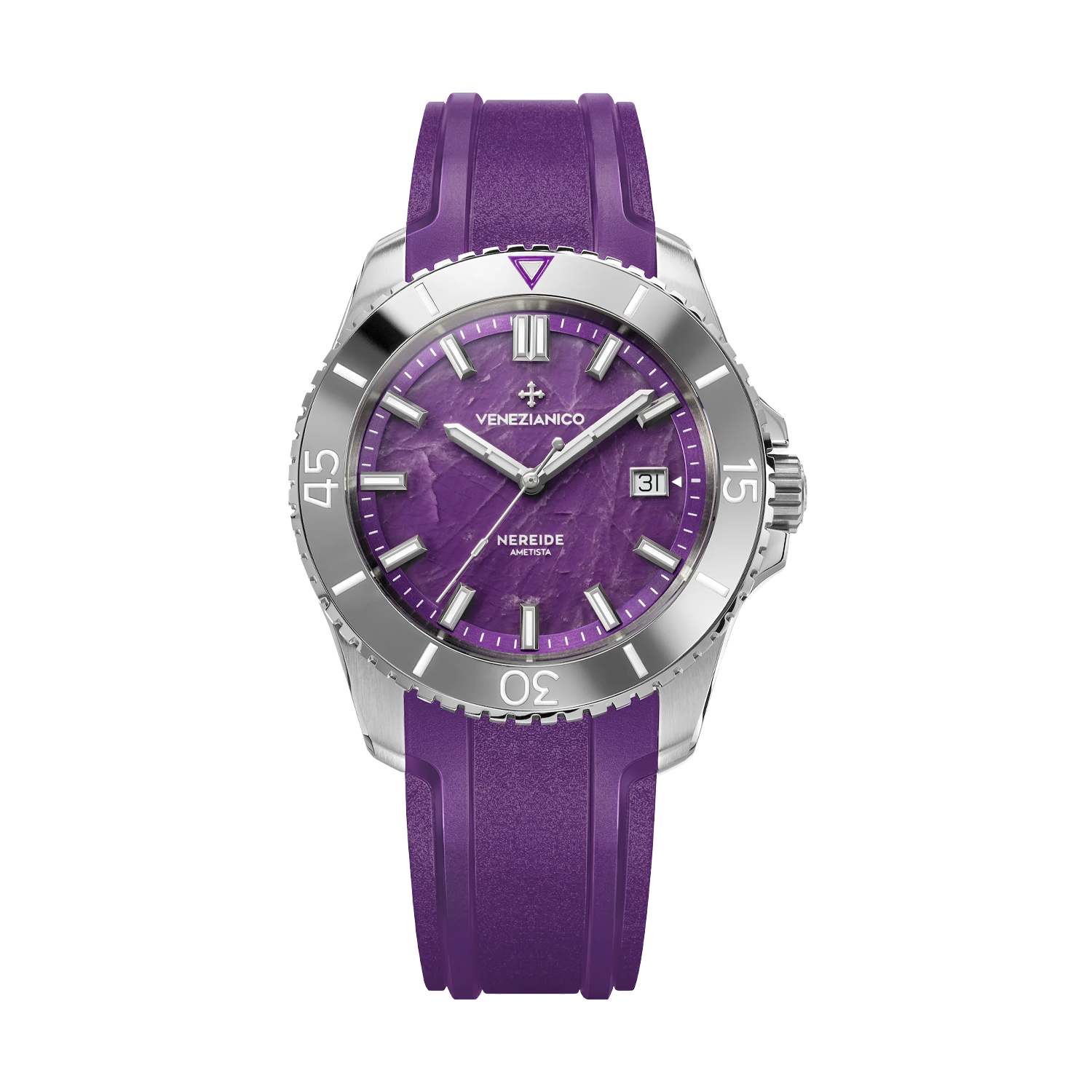 Conhecida por seu tom roxo envolvente e pela forma como reflete a luz, a ametista é usada há séculos em joias de prestígio. Cada peça carrega um brilho único, que transforma o Nereide Amethyst em um relógio sofisticado e visualmente impactante.