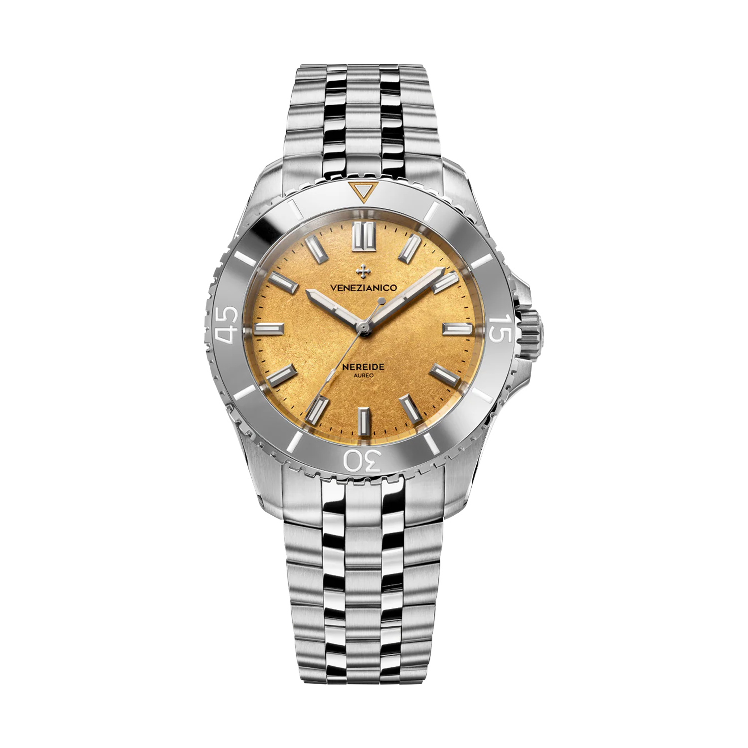 Inspirado na opulência da Sereníssima República, o Nereide Aureo 39 traz um mostrador com tratamento em ouro 24k e acabamento ondulado que evoca a antiga arte veneziana de laminação dourada. O robusto case de aço inoxidável 316L, combinado com bezel de tungstênio e a nova pulseira Sansovino, cria uma fusão perfeita entre elegância clássica e performance técnica para mergulho.