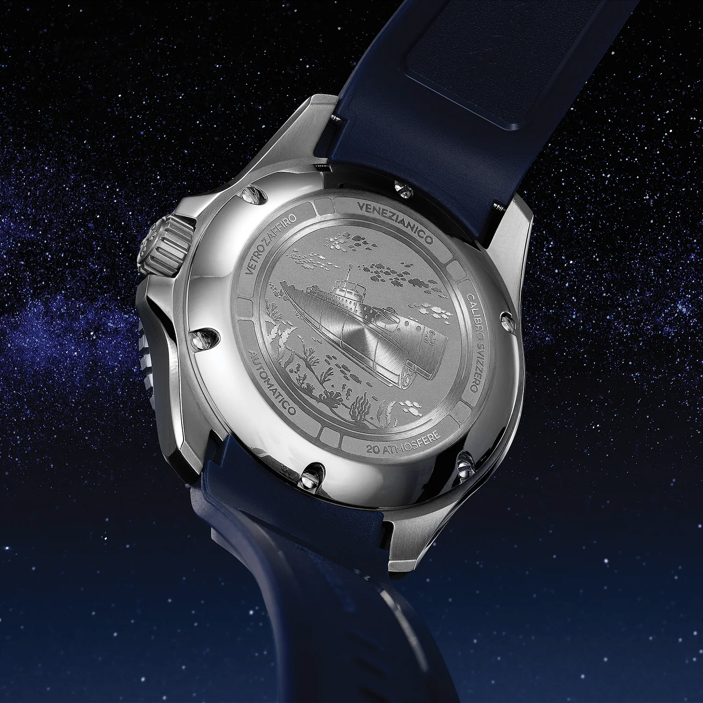 O caseback gravado com o submarino Nereide presta homenagem à tradição naval que conecta Veneza aos oceanos do mundo. Este submarino representa a evolução da maestria naval veneziana, da época das galés comerciais até as modernas embarcações de exploração marítima.
