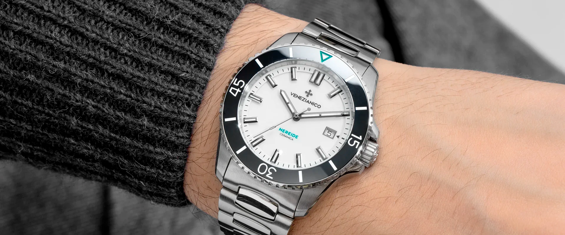 Inspirado no submarino Nereide, uma das últimas maravilhas da tecnologia naval veneziana, o Nereide Cerâmica combina engenharia de mergulho com acabamento artístico italiano em um equilíbrio raro. A caixa de 42 mm em aço 316L, aliada ao bezel cerâmico com 120 cliques, entrega resistência e precisão tátil, enquanto o mostrador com acabamento esmaltado traz profundidade visual e sofisticação incomum para um diver.