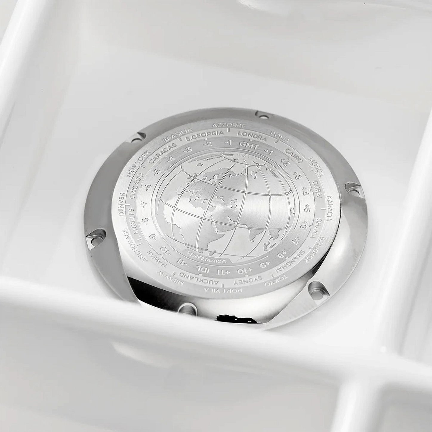 O fundo finamente gravado celebra a adoção (pela primeira vez em 1884) do sistema de 24 fusos horários como um sistema de tempo de referência global baseado no Horário Médio de Greenwich. Em torno da representação do globo terrestre, as principais cidades do mundo são mostradas ao lado de seus respectivos fusos horários. Dessa forma, você pode definir o fuso horário da maneira tradicional sem precisar do seu smartphone.