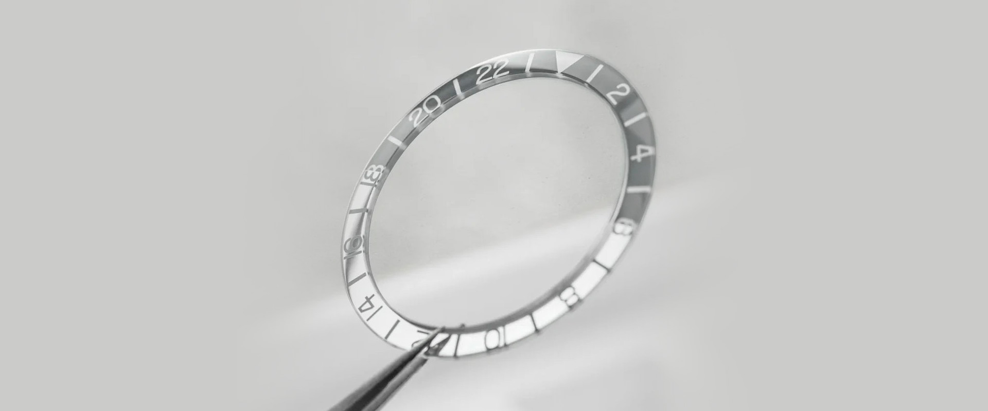 A inserção da moldura é feita de cristal óptico BK7 e adota um acabamento espelhado particular na metade inferior, uma característica única da coleção GMT. Este material tem propriedades físicas excepcionais. É livre de chumbo, mais leve e é dotado de uma qualidade melhor do que outros cristais de vidro. Suas propriedades de baixa dispersão (com números de Abbe em torno de 60) e baixa refração (≈1,52), combinadas com alta clareza, o tornam perfeito para a criação de objetos de vidro de alta precisão e duráveis.