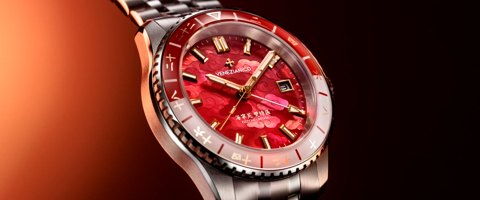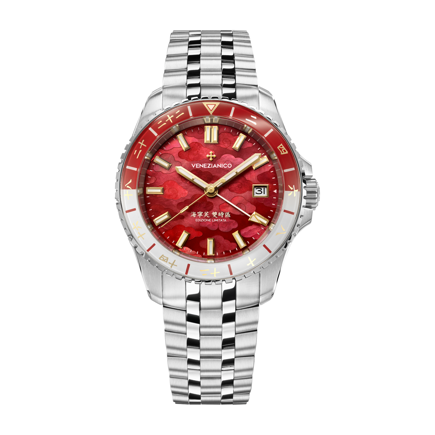 Uma edição limitada de 500 peças celebra os intercâmbios culturais ao longo da Rota da Seda, criando um diálogo entre Veneza e o Oriente. Xi'an, o ponto de partida desta rede milenar de rotas comerciais e culturais, é a alma inspiradora do projeto. O mostrador, montado à mão a partir de madrepérola vermelha trabalhada em um padrão de mosaico, reinterpreta o motivo tradicional da nuvem, um símbolo de prosperidade e boa sorte na cultura chinesa.