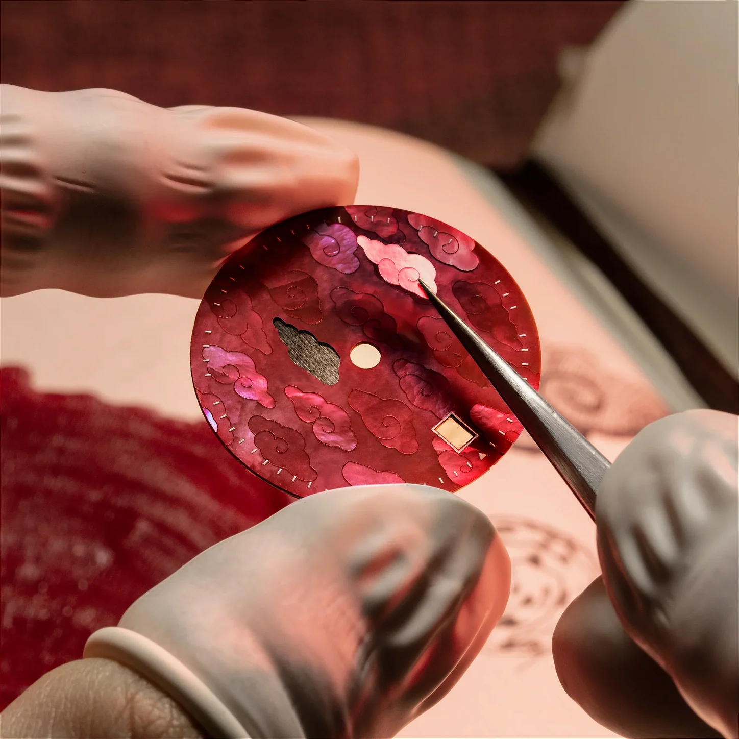 Esse artesanato decorre de um processo meticuloso e totalmente manual. A madrepérola é cuidadosamente selecionada e cortada em pequenas telas inspiradas no motivo da nuvem, depois aplicada individualmente em uma base de latão para construir uma composição precisa e harmoniosa. A iridescência natural do material, juntamente com seus tons vermelhos, tornam cada mostrador único, com variações de cores sutis que mudam com a luz..