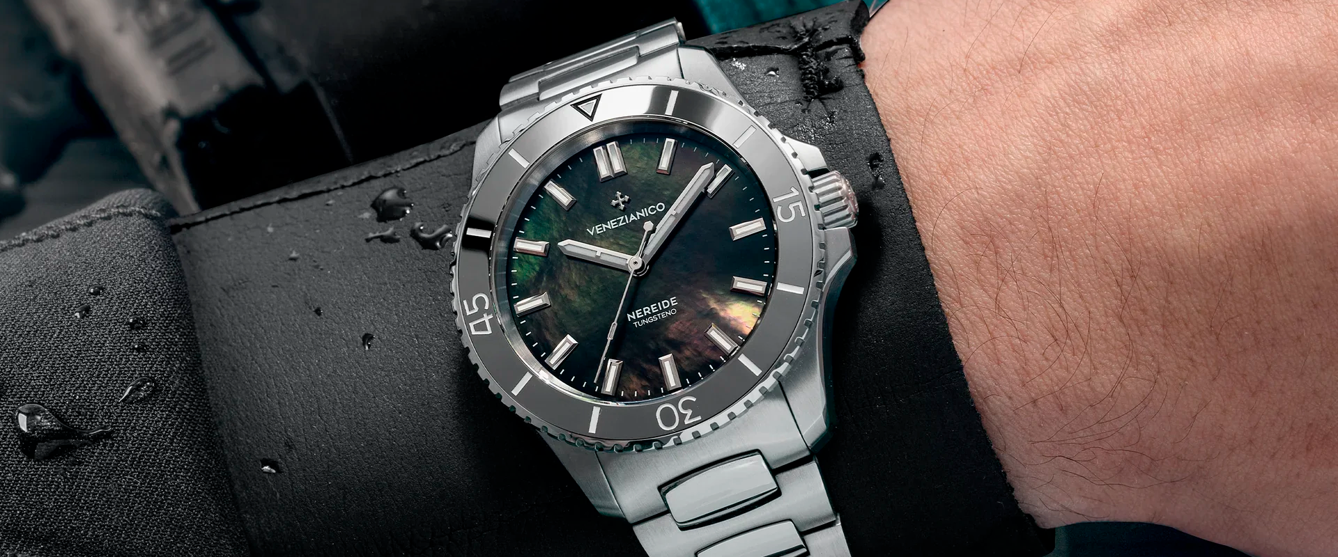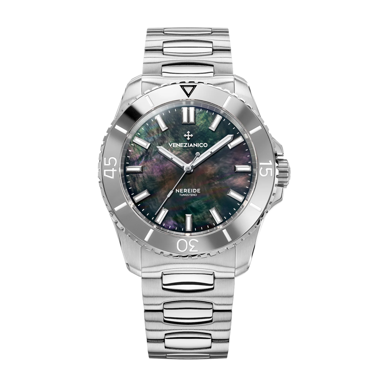 O Nereide Tungsteno 42 combina design refinado com performance de mergulho. Seu mostrador em madrepérola revela reflexos únicos, que mudam conforme a luz, enquanto a caixa em aço 316L e o bezel de tungstênio reforçam a robustez do modelo. Com inspiração na estética veneziana, o design limpo, proporções equilibradas e acabamento premium valorizam um visual moderno e sofisticado. Equipado com o Miyota 9039, cristal de safira antirreflexo e 20ATM, é um relógio pensado para quem busca beleza, técnica e versatilidade no dia a dia.