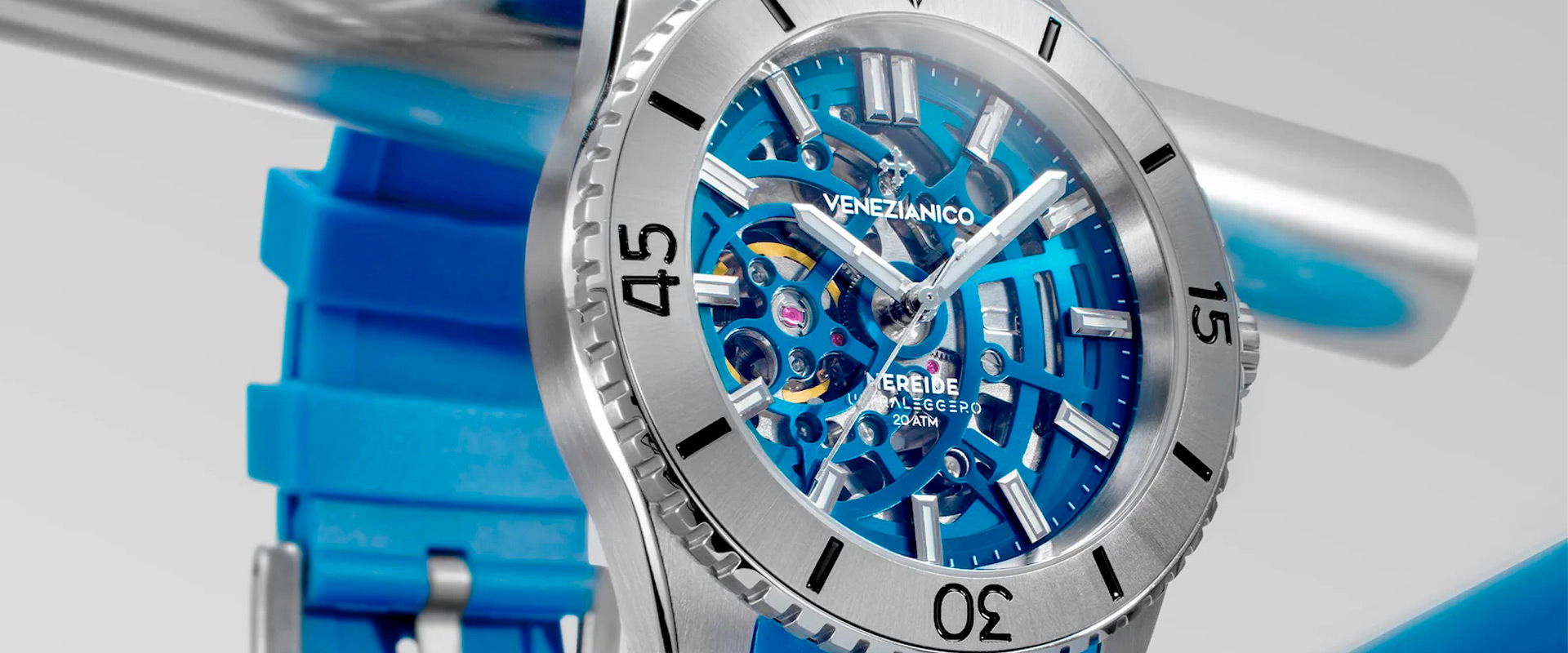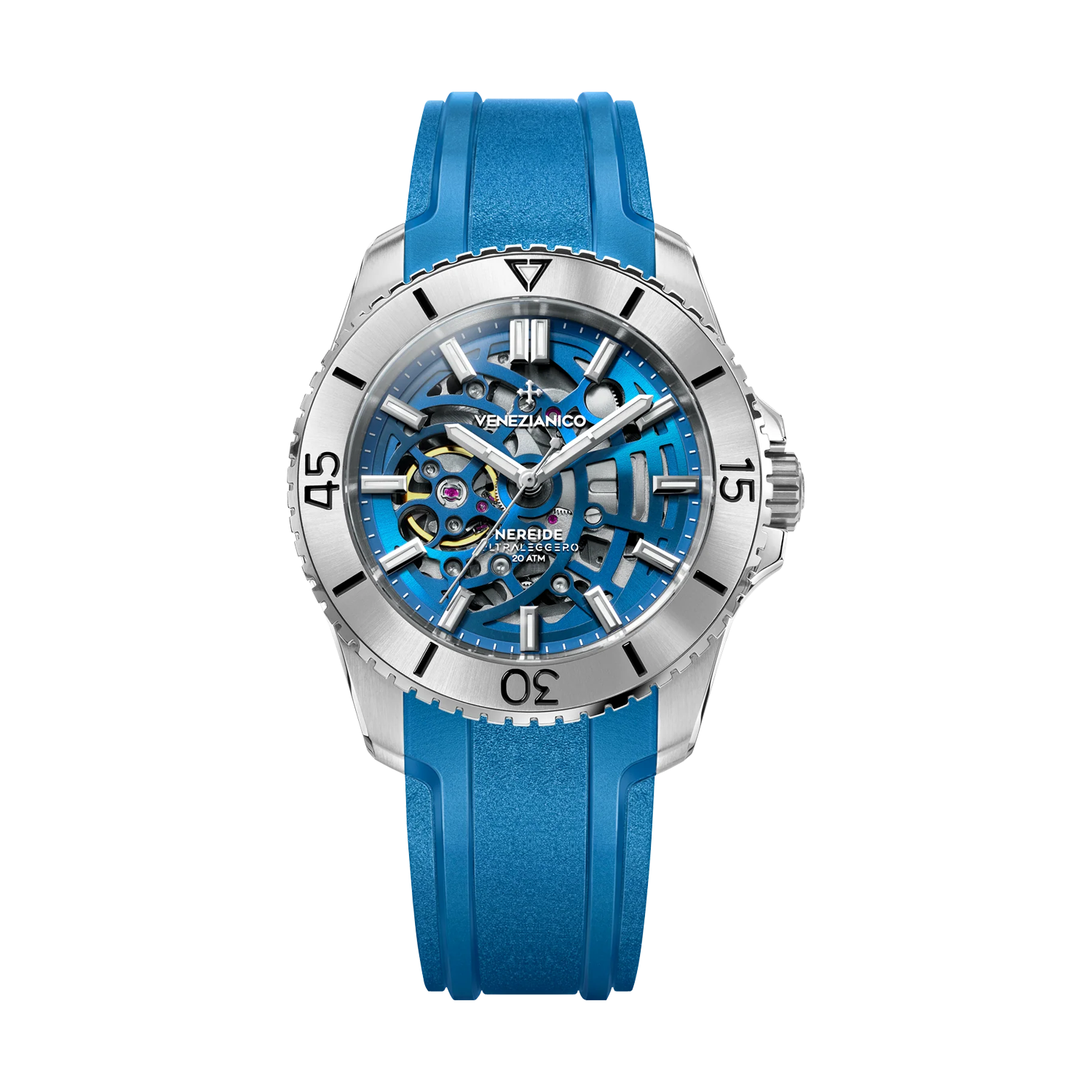 O Nereide Ultraleggero é um relógio com uma identidade forte e uma alma esportiva. Possui um design refinado, enriquecido por uma alça de borracha que segue harmoniosamente a forma da caixa. Sua elasticidade e flexibilidade oferecem conforto excepcional ao pulso, garantindo resistência superior à abrasão e variações extremas de temperatura, incluindo condições de -30°C a +70°C.