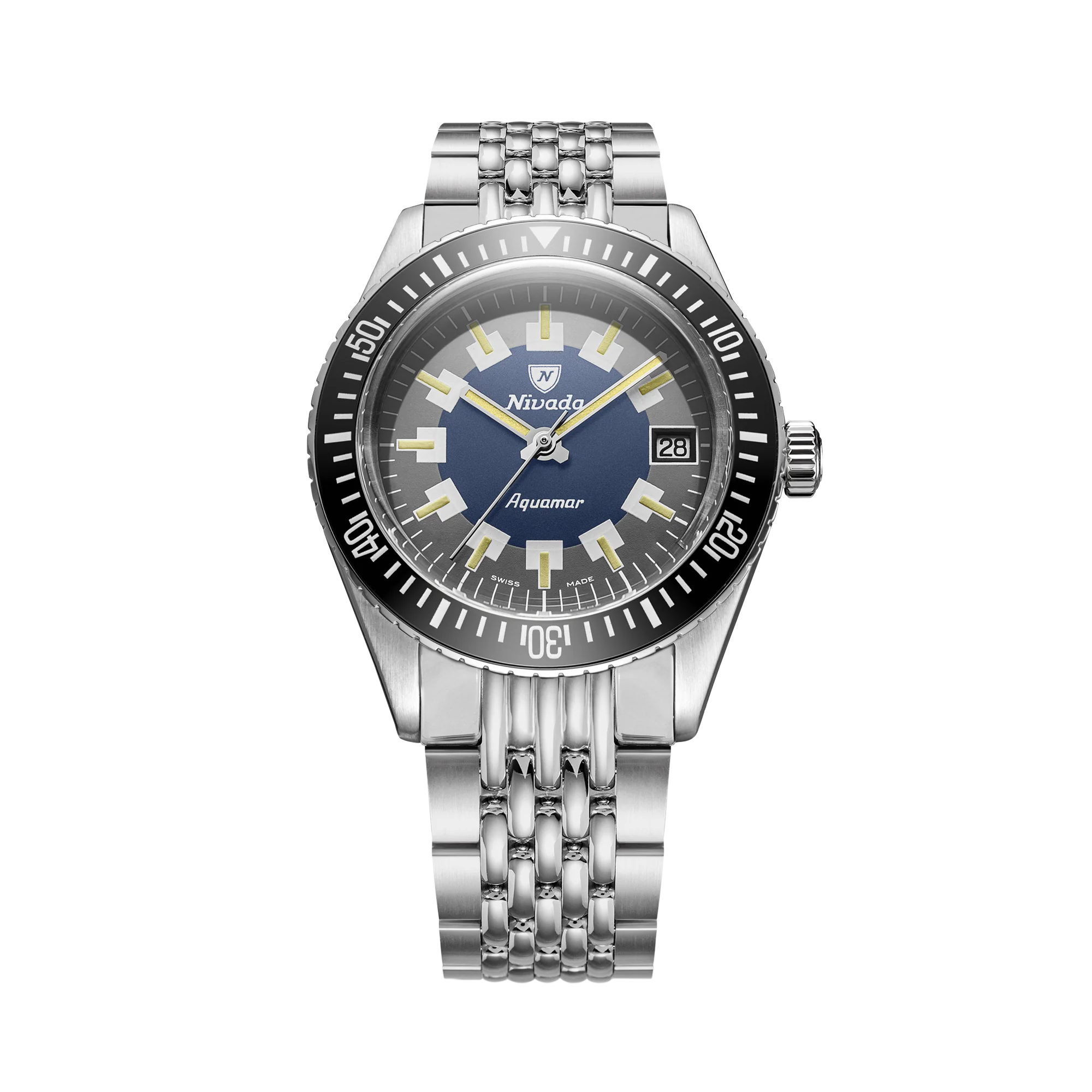 O Aquamar Vintage nasce de uma descoberta genuína de colecionador: o reissue de um mostrador encontrado por Guillaume Laidet nos arquivos da Cenic, esquecido por décadas. Ao trazê-lo de volta à vida, a Nivada Grenchen preservou toda a alma vintage do original e o combinou com o know-how relojoeiro contemporâneo — oferecendo aos entusiastas uma peça de história real no pulso.